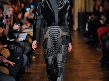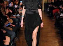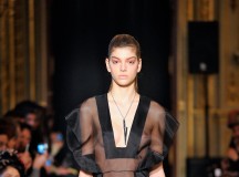 Les imprimés sont géométriques et les appliqués pourraient presque rappeler le travail d’Iris Van Herpen. Les volumes, dramatiques, car le drapé est toujours de paire avec des ceintures dorées serrant la taille. La tendance des robes portées sur les pantalons apparaît ici aussi.