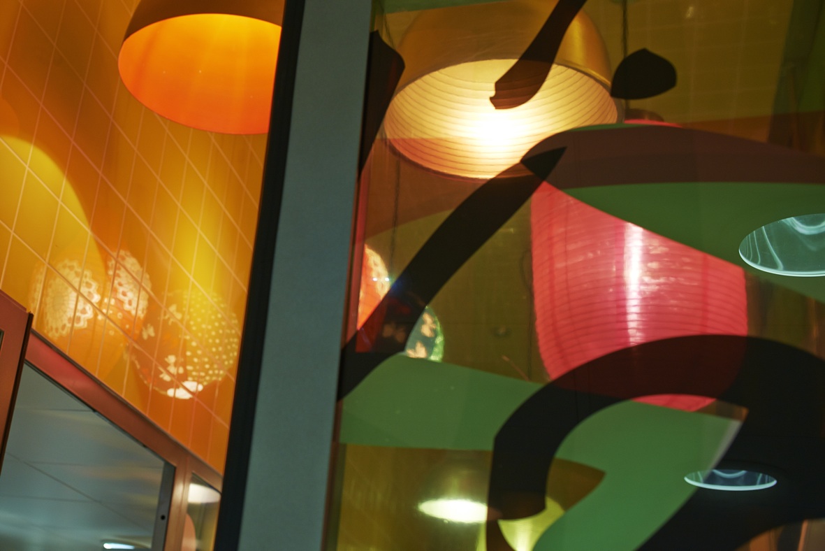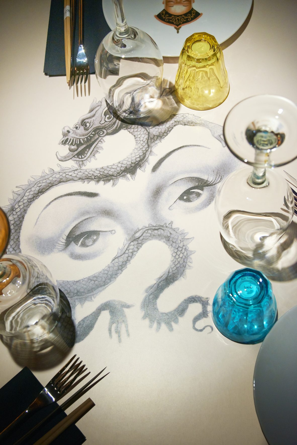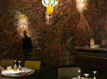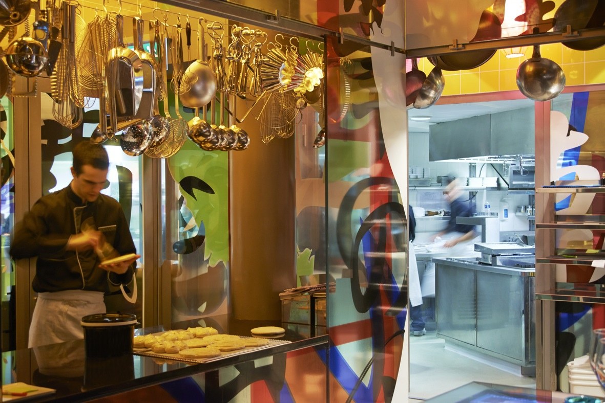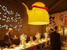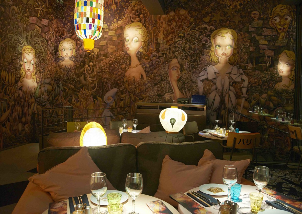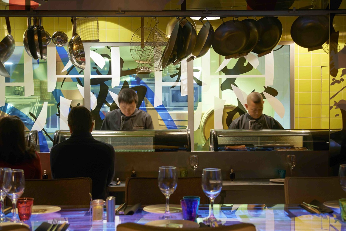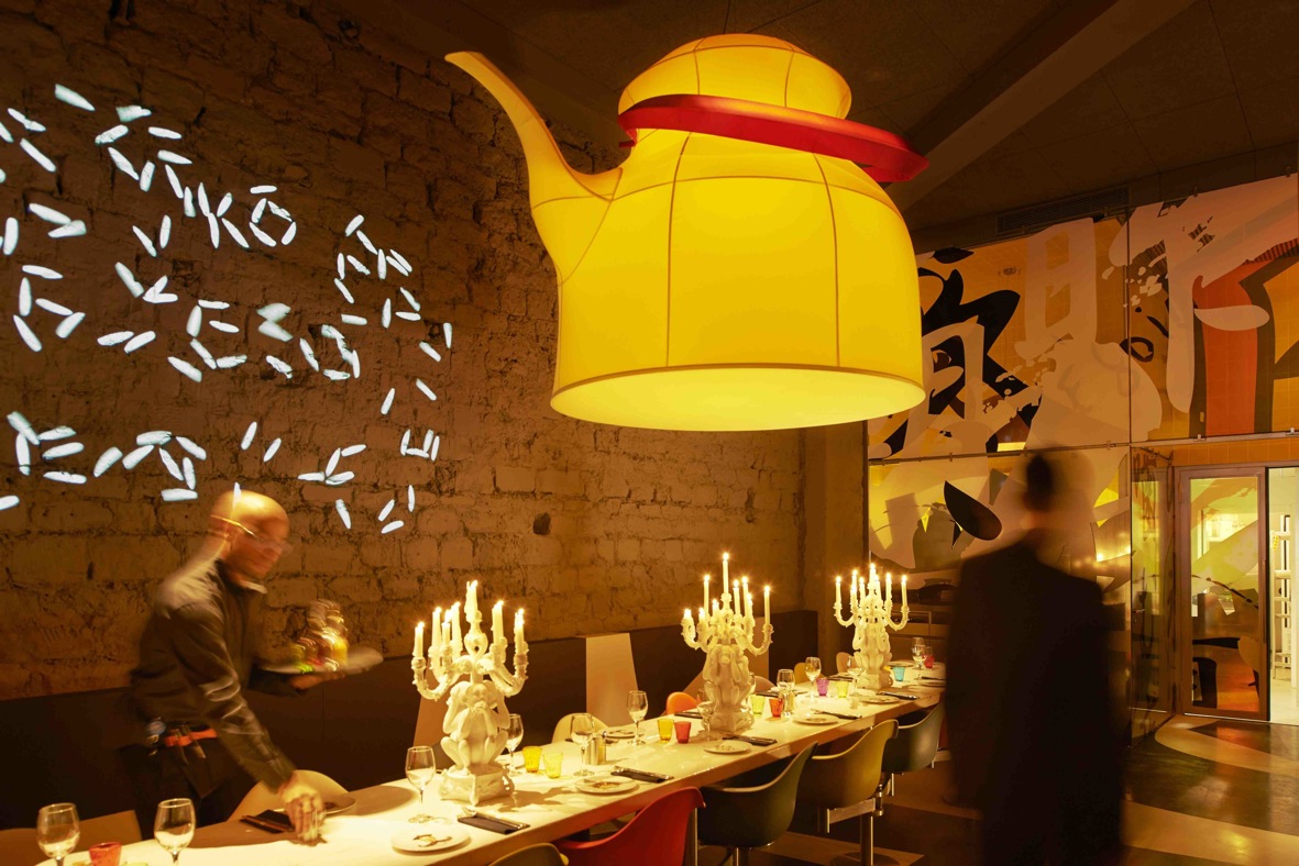 En salle, quelques éléments maîtres sont les pivots de l’architecture intérieure comme l’immense bar d’écrans, la spectaculaire fresque de David Rochline ou la gigantesque théière détournée en lampe. Autour d’eux, les signes aux résonnances asiatiques foisonnent, le gris et les couleurs s’entrechoquent. Le mobilier rapproche des pièces contemporaines et des pièces d’inspiration extrême-orientale.