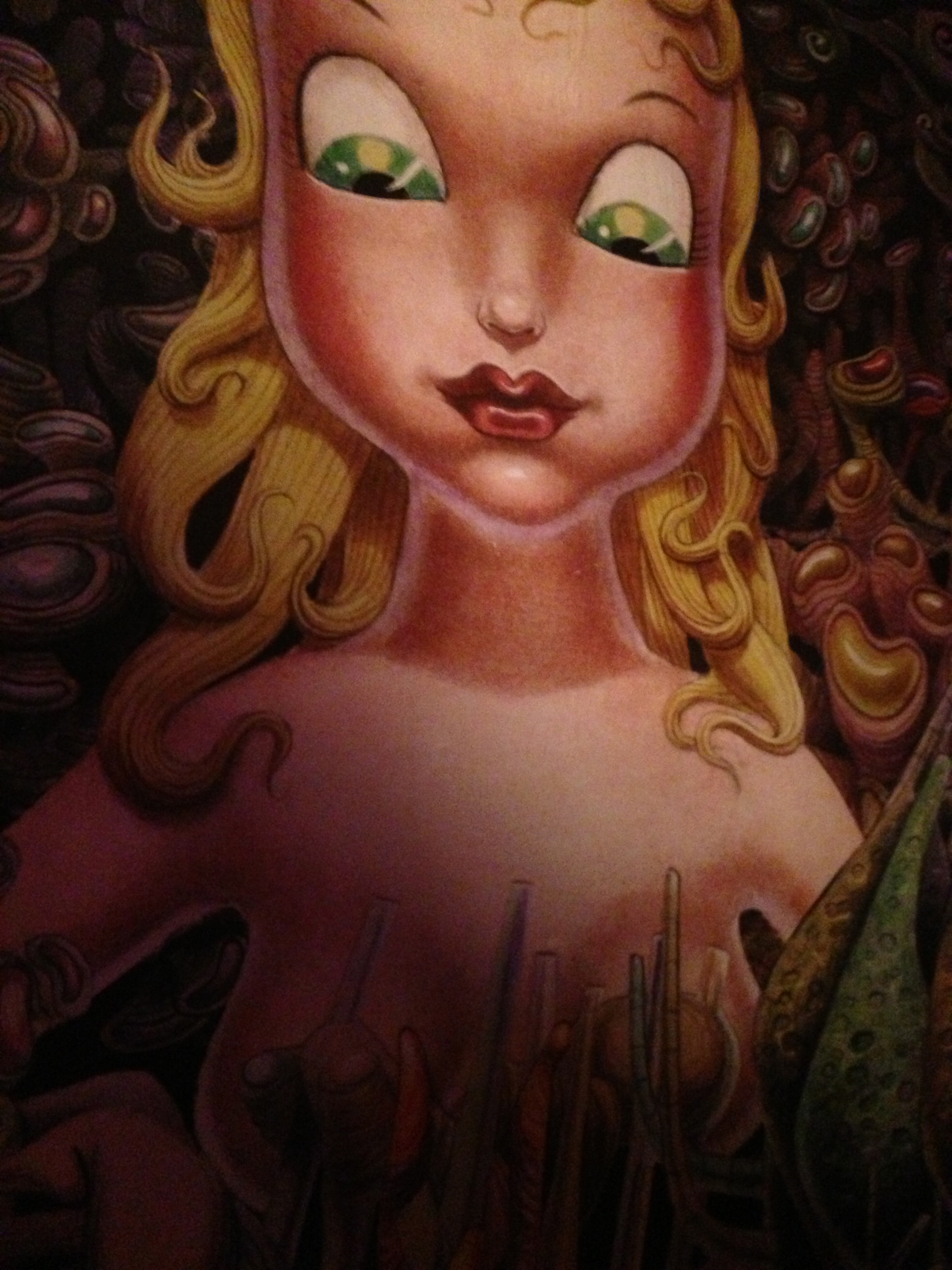 Anticonformiste, déconcertante, cette oeuvre est avant tout poétique. L’abondance des images fascine, elle souligne l’horreur du vide, l’éloge du beau bizarre cher à Baudelaire et à Rochline. Avec Philippe Starck, ils ont composé les lignes directrices de cette toile de fond dont le carton a été réalisé selon une technique minutieuse, qui associe l’aquarelle, le crayon et la gouache. L’oeuvre, qui court sur un mur de quinze mètres de longueur évoque autant le papier peint qu’un manga futuriste, dans une contagion sans redite de motifs, ponctuée de personnages fantasmatiques qui dialoguent par le jeu des regards. Cette curiosité visuelle, imaginée comme une histoire purement graphique, s’apprécie tant dans les détails, que dans un regard d’ensemble.