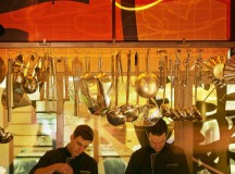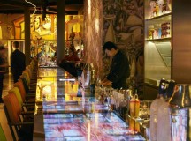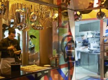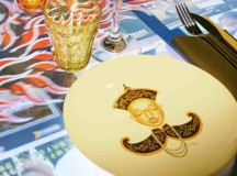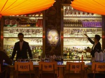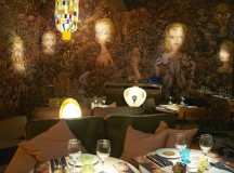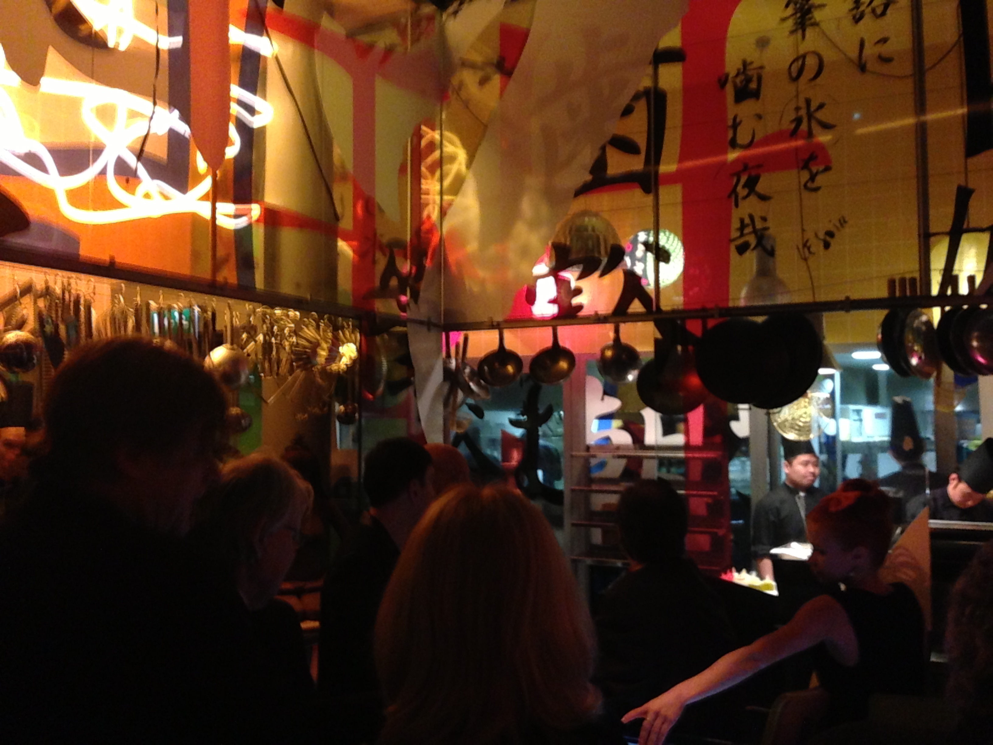 Vision d’un futur globalisé, dont l’Asie serait le nouveau centre de gravité, cette perspective de ruelle incandescente ménage autant de scénarios d’appropriation, que de points de vue. Les 200 couverts distribués dans l’atmosphère joyeuse de cette “cour des miracles” Ph. S. se répartissent entre la terrasse sur l’avenue George V, autour du spectaculaire bar d’écrans, face au comptoir à sushis, autour de la table d’hôtes ou sur les tables de 2.