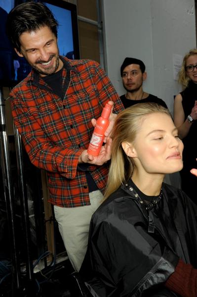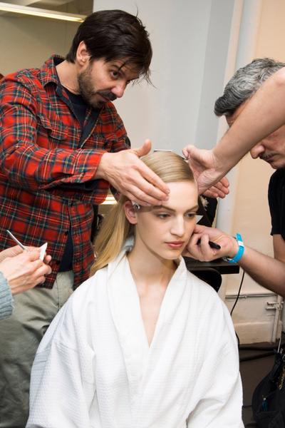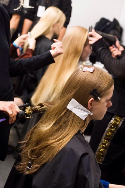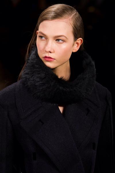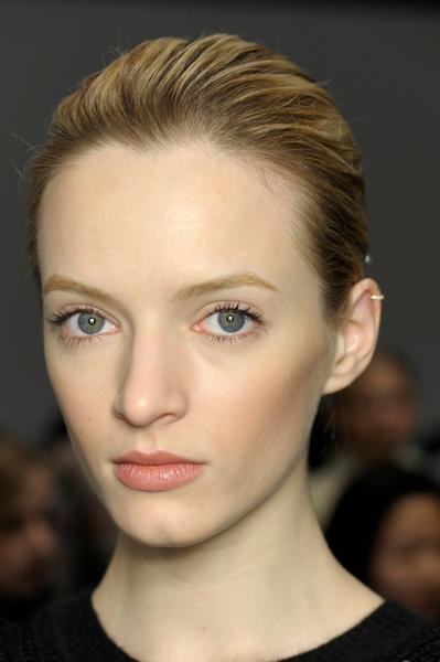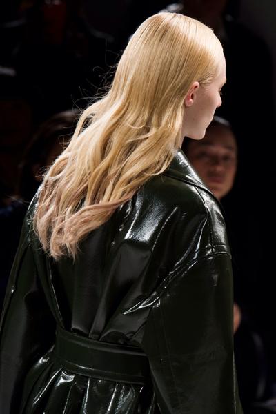 Look beauté sur le défilé Calvin Klein: ondulations créées au fer à friser sur la fin des longueurs, les cheveux sont strictement séparés sur le côté, la bouche est framboise, les pommettes rosées pour l’effet « J’ai bonne mine même si j’habite à New York ».