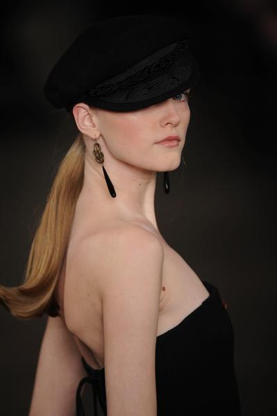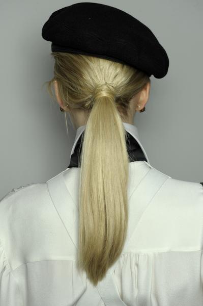 Look beauté sur le défilé Ralph Lauren: teint glossy et maquillage minimaliste (lèvres pêche et mascara léger), un peu de volume est créé au dessus de la tête pour ramener les cheveux en queue de cheval. On masque l’élastique avec une mèche, of course!