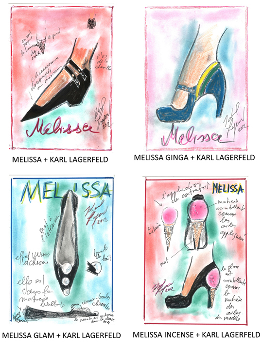 La 1ère collection capsule de Melissa+Karl Lagerfeld est enfin dévoilée. Découvrez les 4 modèles de chaussures sur les croquis de Karl Lagerfeld.