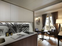 Le bâtiment, un superbe immeuble datant de 1908, présente une façade typique Art Nouveau en pierres de taille ornée de balcons, sculptures et colonnades et constitue l’écrin de cette splendide résidence. L’architecture du bâtiment rend l’agencement de chaque suite unique et renforce ainsi l’impression de «boutique résidence».