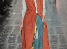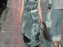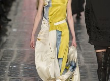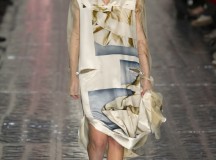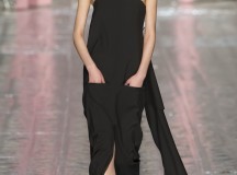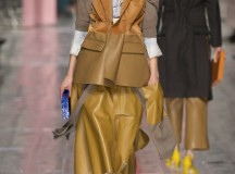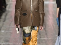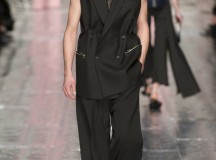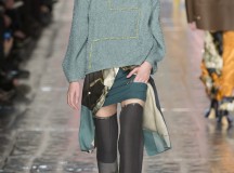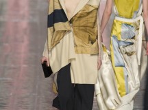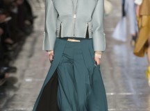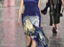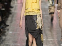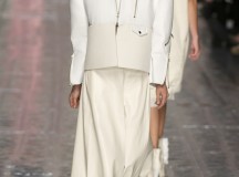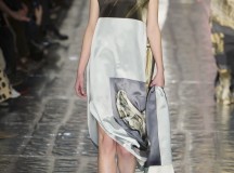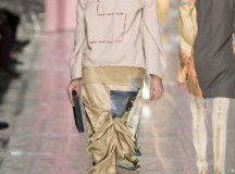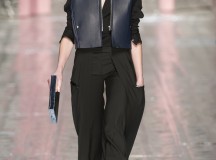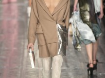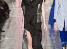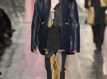 Les jeux de longueurs sont très présents, renforcés par des asymétries sur les jupes (mini à l’avant et longues à l’arrière) et les cuissardes/bas/peep-toe. Les drapés sont aussi au rendez-vous appuient le mouvement des vêtements : fluide mais efficace. On retrouve aussi le mélange de matière avec des vestes en cuir qui structurent une silhouette plutôt aérienne (ou encore des pulls en maille et chaîne en métal qui viennent casser le côté éthéré des pantalons loose)