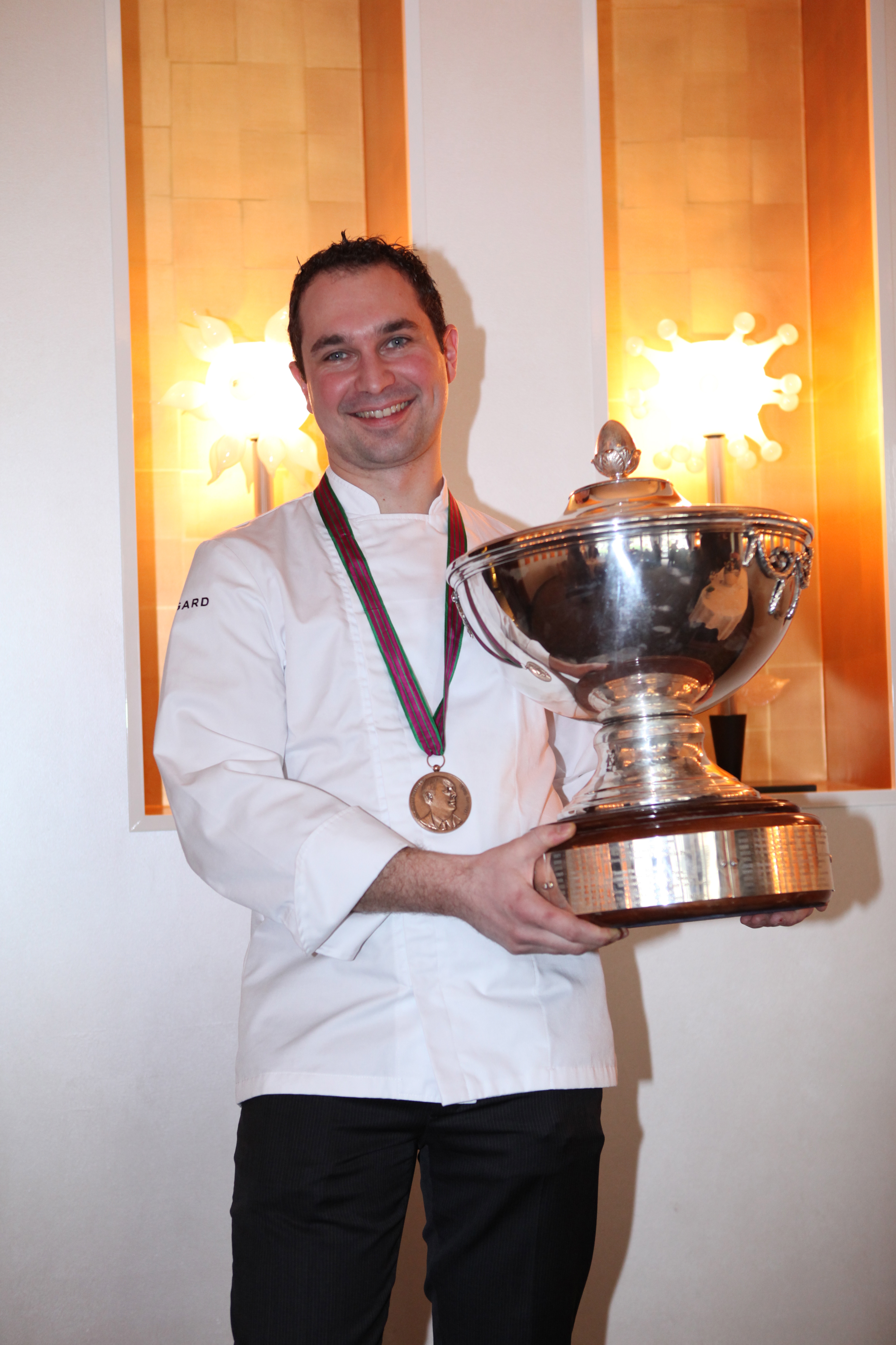 Christophe Schmitt, sous-chef du Diane, restaurant une étoile Michelin de l’Hôtel Fouquet’s Barrière, reçoit la Coupe du Prix Culinaire International Pierre Taittinger