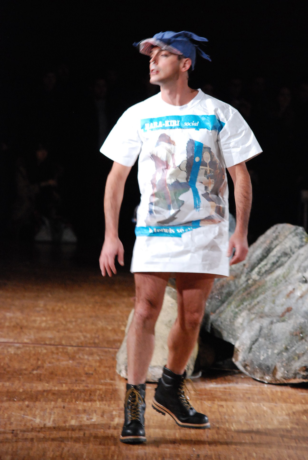 Les tissus ressemblent à du papier chez Bernhard Willhelm, mélanges de volume, de plissés et de couleurs criardes, c’est aussi un spectacle pour nos rétines qu’offre le créateur. Cette saison, il nous présente aussi une collection pour femme incluant jupes, pulls qui se remarquent par le choix des couleurs (le fluo a le vent en poupe) ou le choix des imprimés (« classified ad » ou petites annonces, opinions affirmées à renfort de slogan).