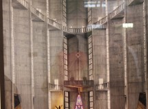 A ray of light penetrates into the church from a cross shaped window as a pilgrim walks by.