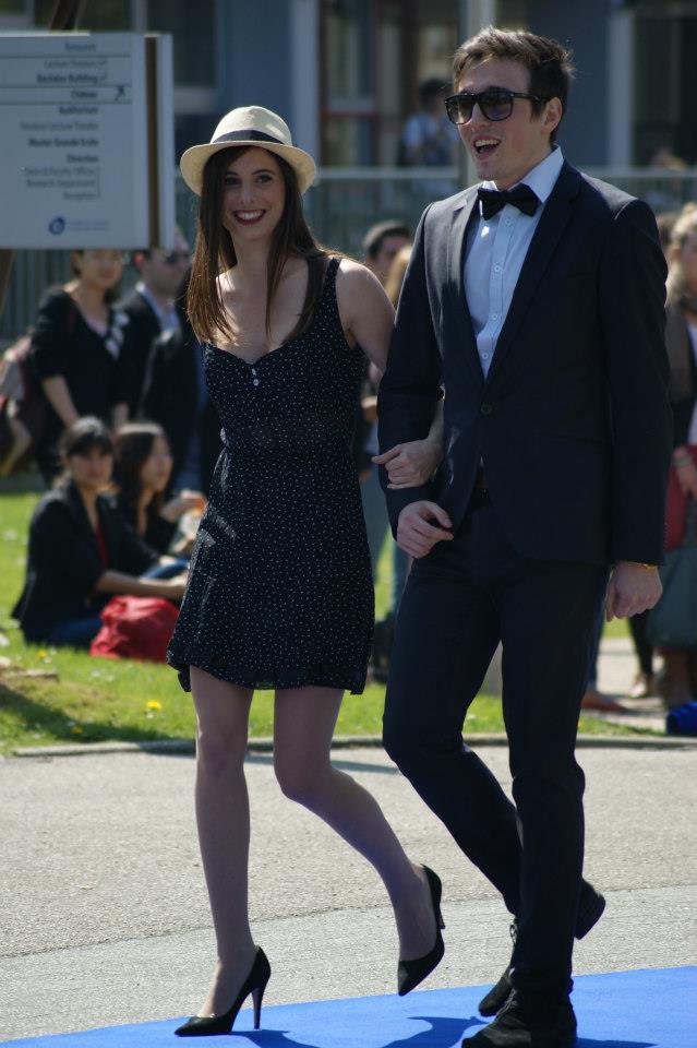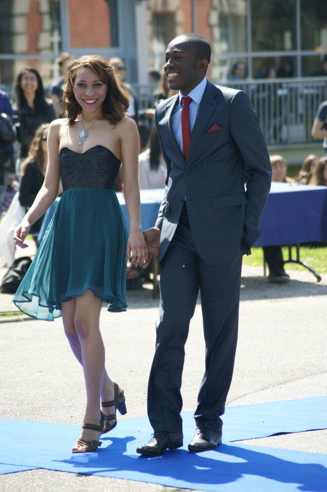 Le temps, radieux et doux, collait parfaitement à l’ambiance joyeuse et collégiale du moment. Dès mon arrivée à l’école (en charmante compagnie), j’étais accueillie par le contexte du défilé : celui-ci serait à l’extérieur, je serai assise au premier rang (!!!) parmi les administrateurs de l’école. Des tapis bleus délimitaient le runway (et je ne pu m’empêcher de repenser à tous ces défilés ou l’on a pas le droit de marcher sur le podium avant le défilé!). J’ai rarement été aussi surprise par la façon dont on m’accueillait et l’attention que je recevais! Adrien et moi avons profité que le show se mette en place pour aller faire une visite éclair backstage ou j’ai pu apprécié l’ambiance qui régnait entre les étudiants devenus modèles pour l’après-midi se préparaient et riaient.