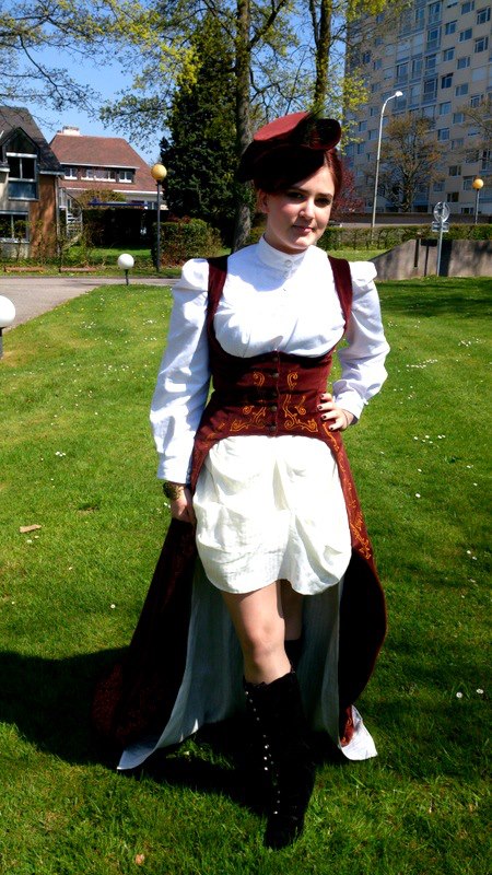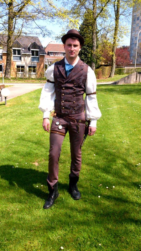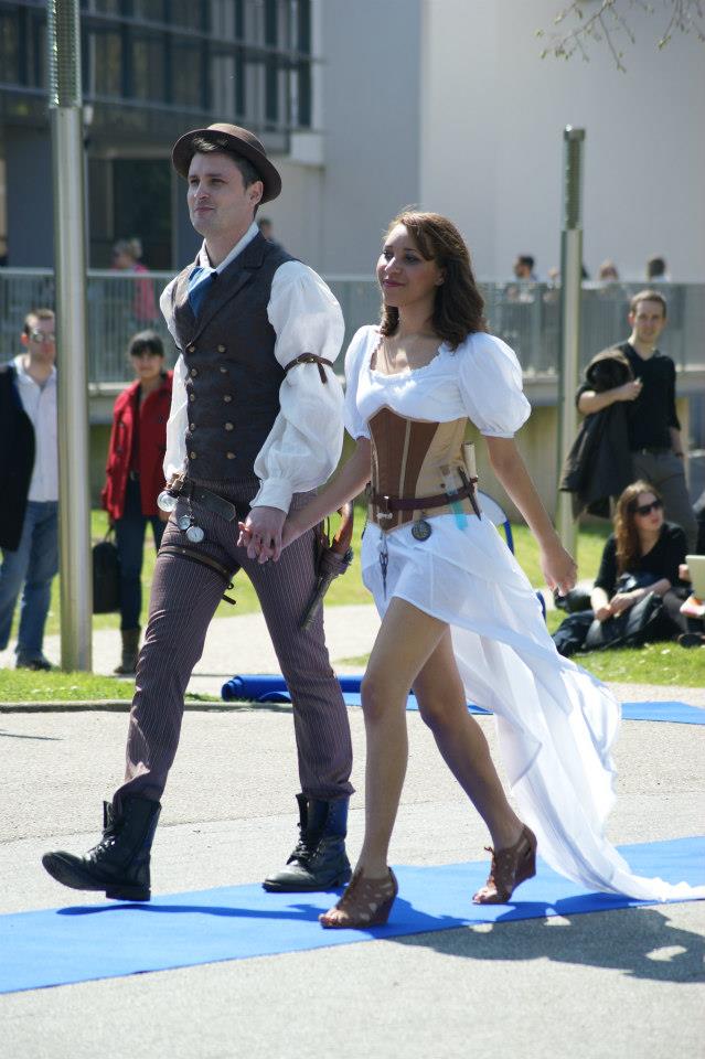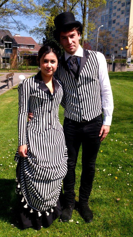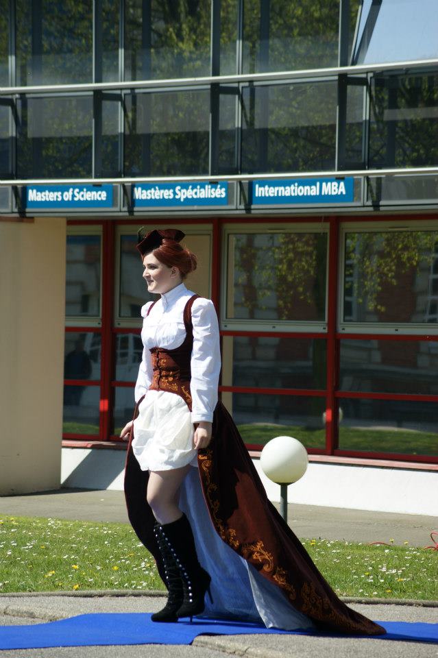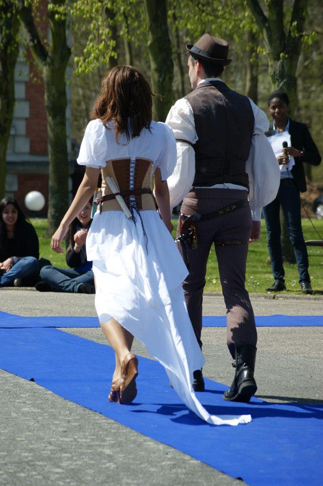 Et c’est avec Jeffrey Fernandes Soares (Aucun lien avec Adrien SAHORES, je tiens à le préciser), le plus « professionnel » des créateurs présents. Originaire de Rouen, ses créations sont inspirées par l’époque victorienne avec une forte inspiration steampunk. Les vêtements, compromis entre histoire et création de mode incluent des corsets, de longues traines, des accessoires pour le moins surprenants (la ceinture à fioles et ciseaux!) et dégagent une aura théatrale. La forme des jupes, les chapeaux et le beau temps me rappelent forcément la scène de tableau de Georges Seurat « Un dimanche après-midi à l’Ile de la Grande Jatte » et les silhouettes masculines et fémininés nous sont présentées.