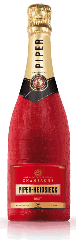 La bouteille Piper-Heidsieck Brut est enveloppée d’une peau de crocodile rouge en latex. Audacieuse, inédite, résolument sauvage cette peau rouge protège l’or d’un vin qui est plus remarquable encore que son habillage.