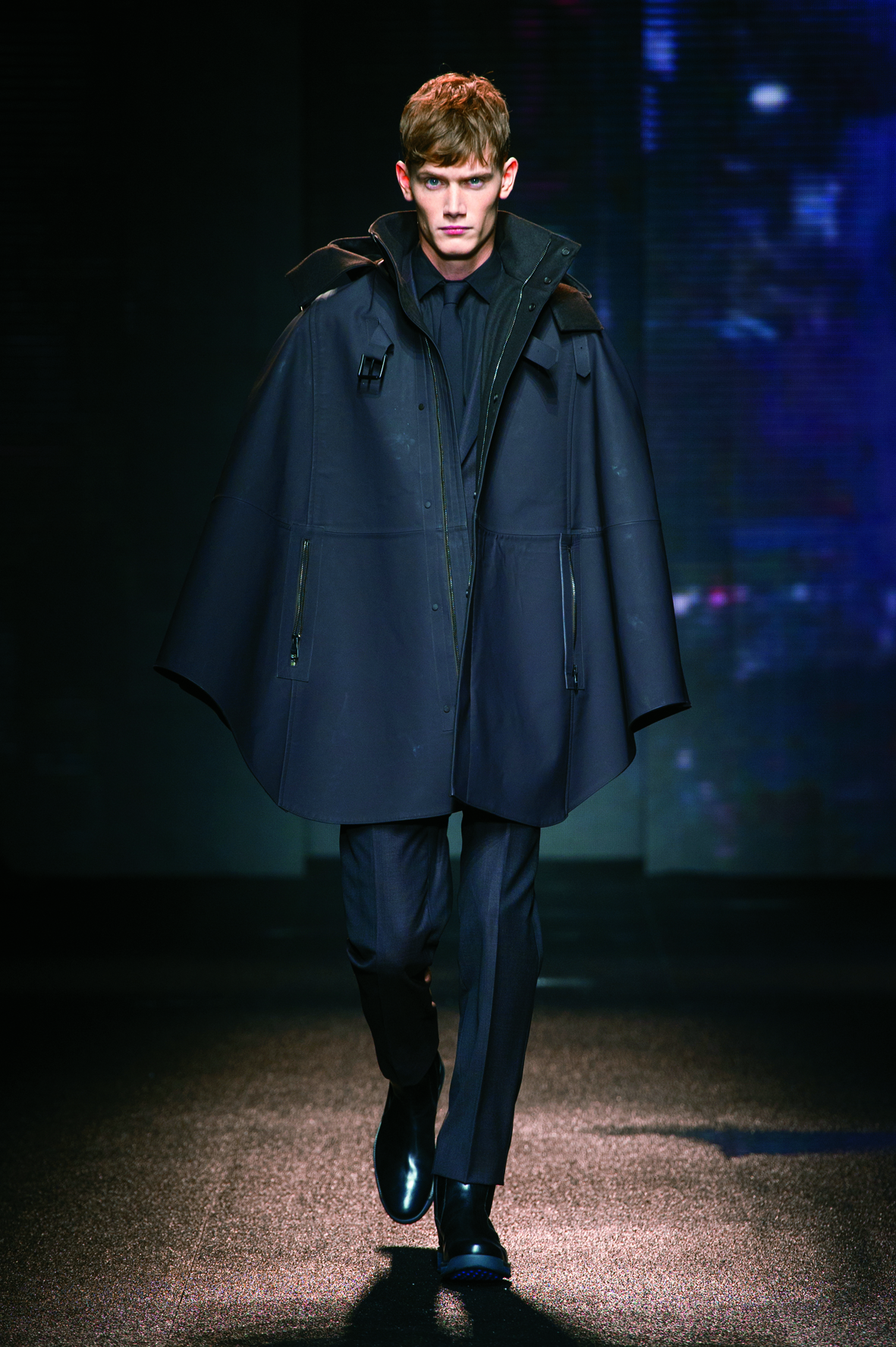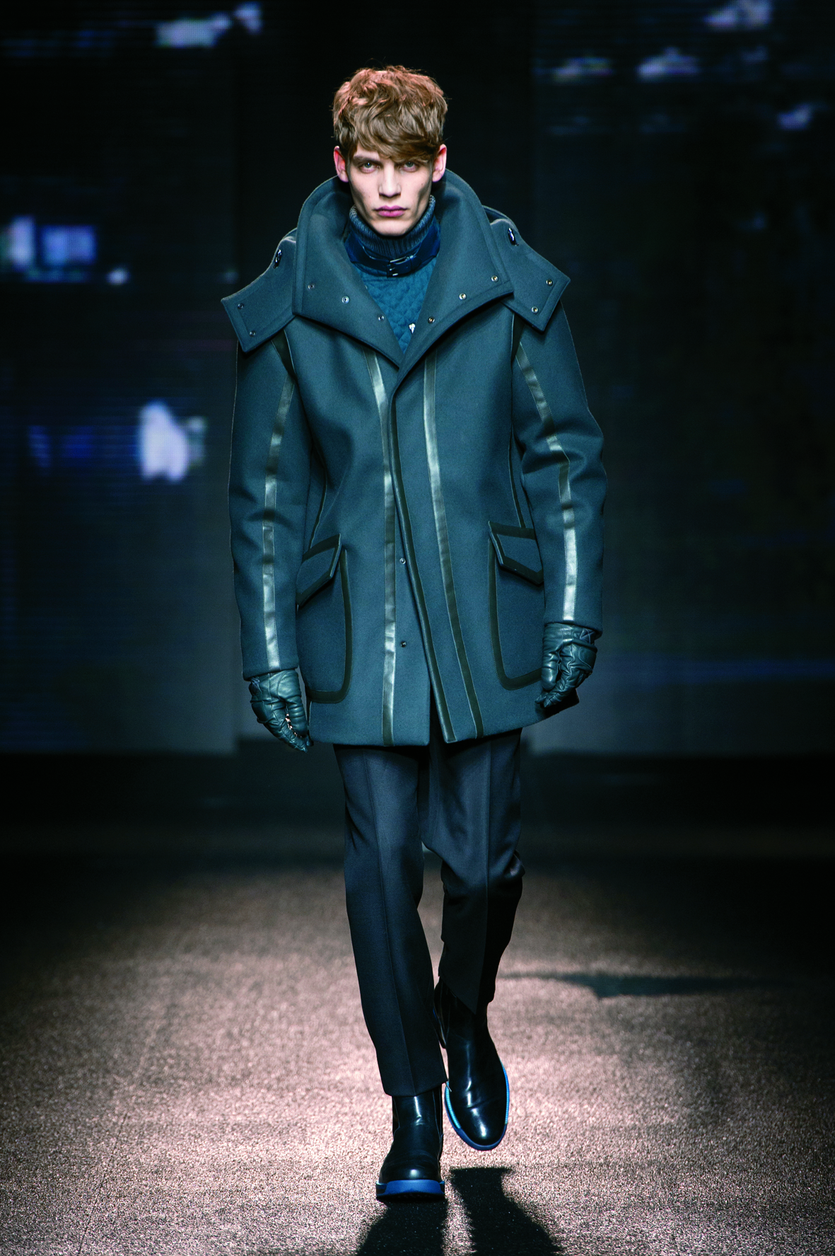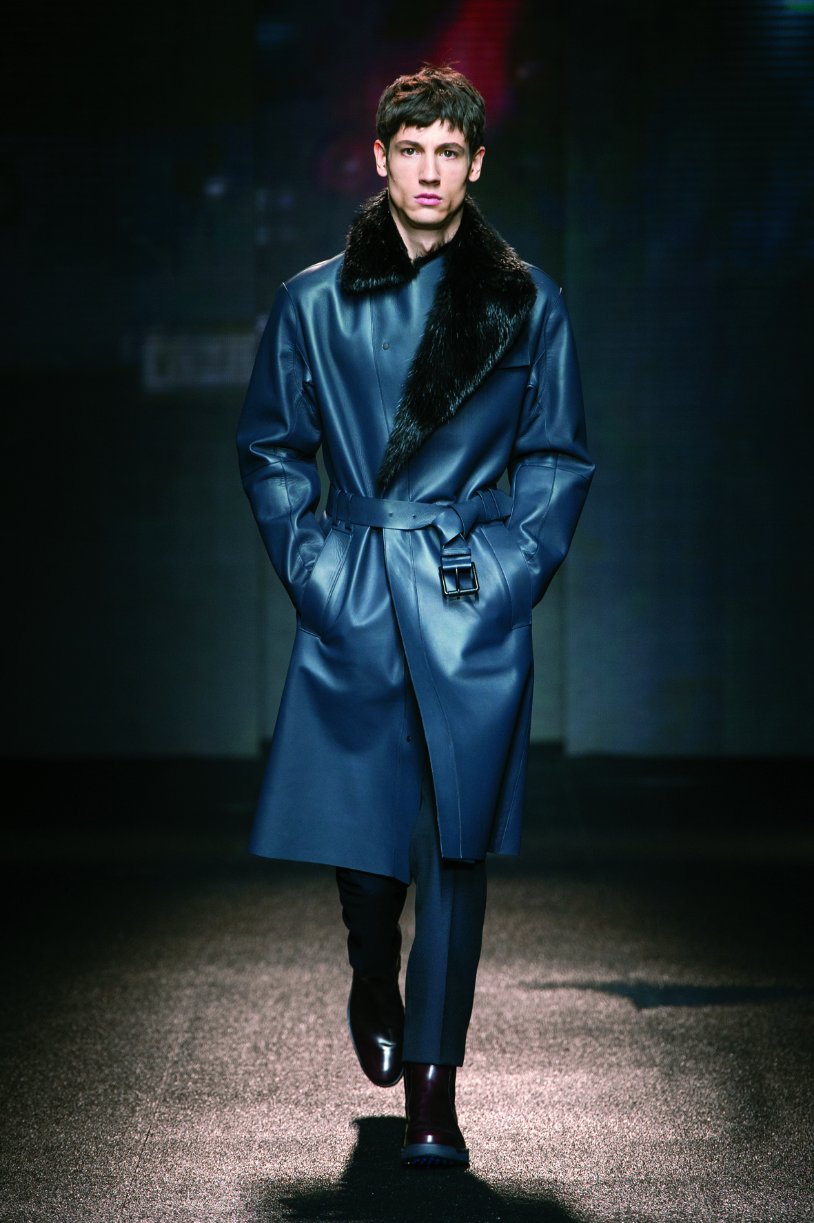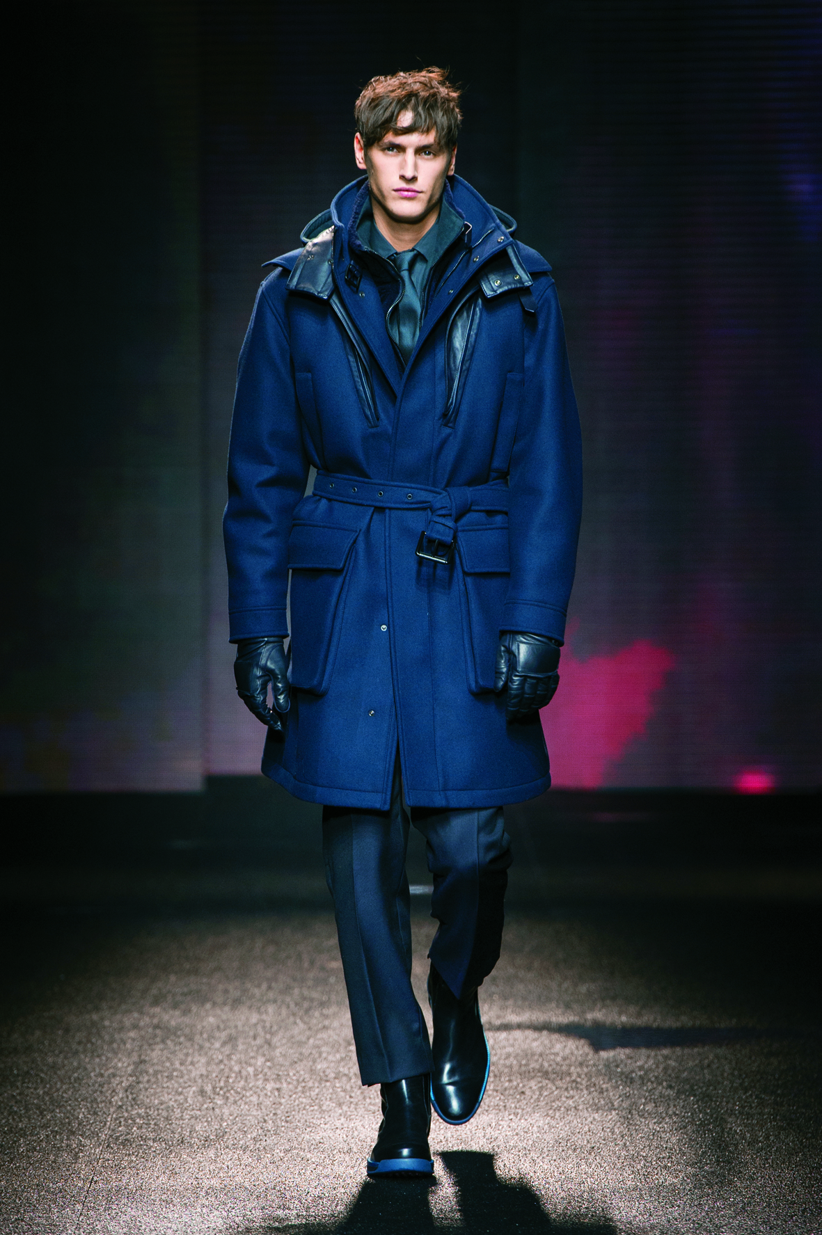 Le cuir étant donc le domaine dans lequel la maison excelle, on le retrouve tout au long de la collection : bandes et empiècements sur les manteaux et les capes, gants, bottines, mocassins. Même s’il reste classique, l’homme Ferragamo n’est pas pour autant désuet. En effet, mélanger bleu marine et noir avec goût s’avère être un de tour de force que la maison réussit sans encombre.