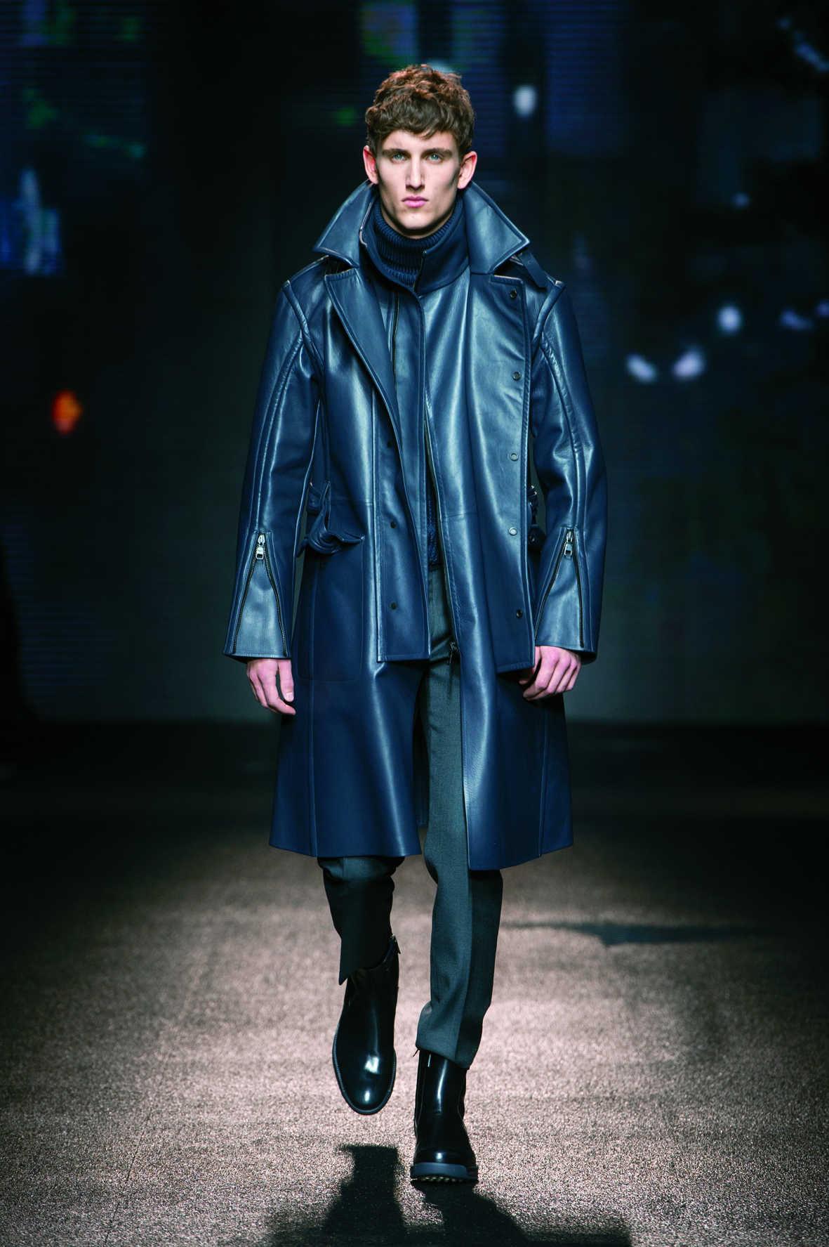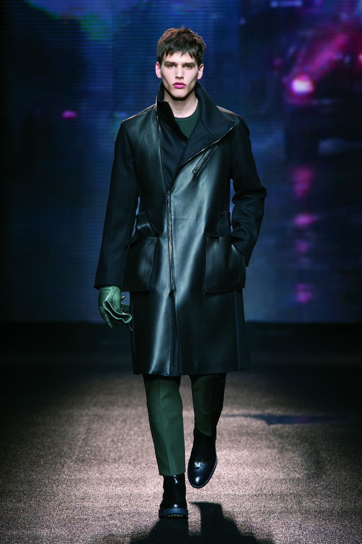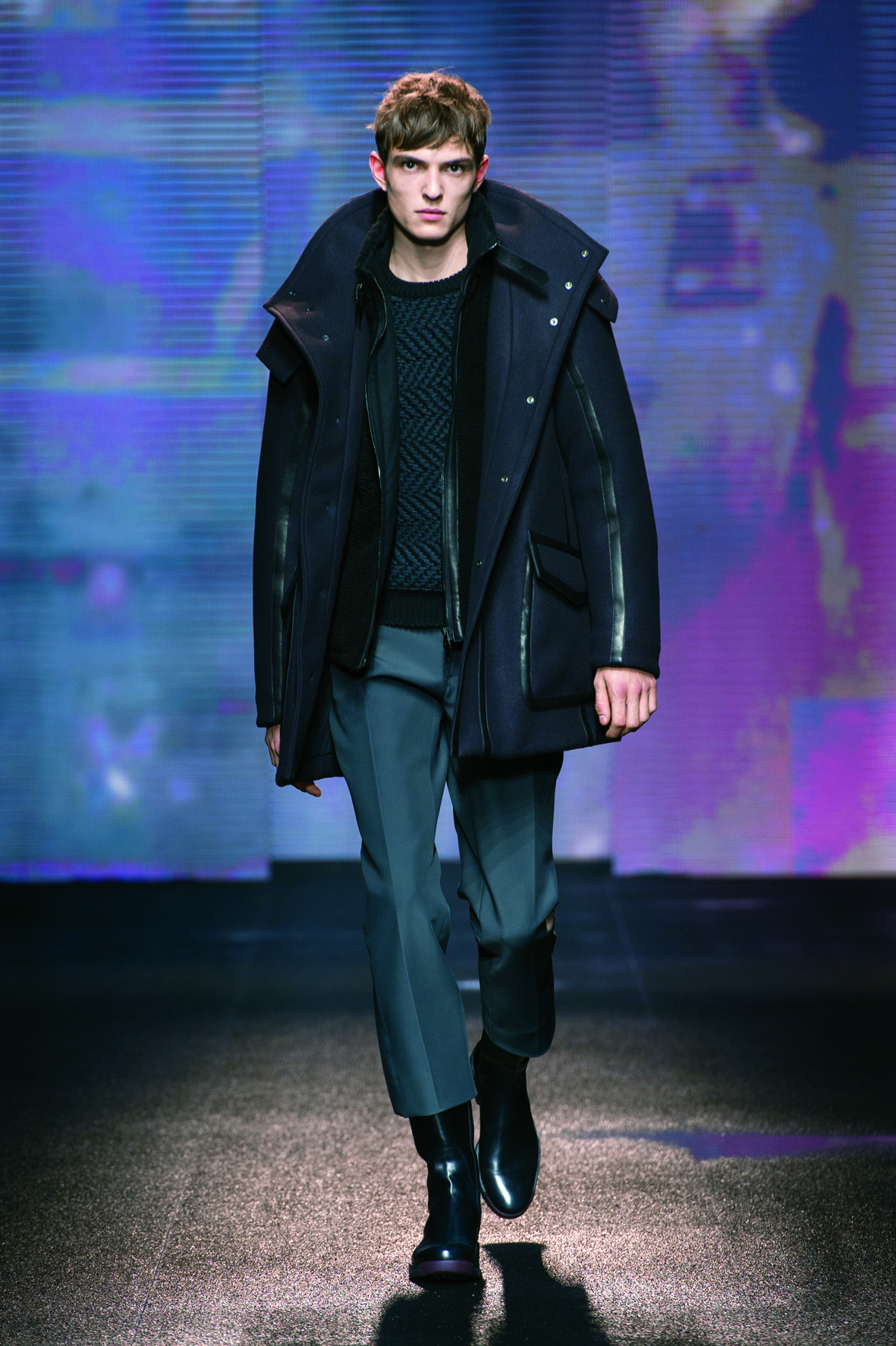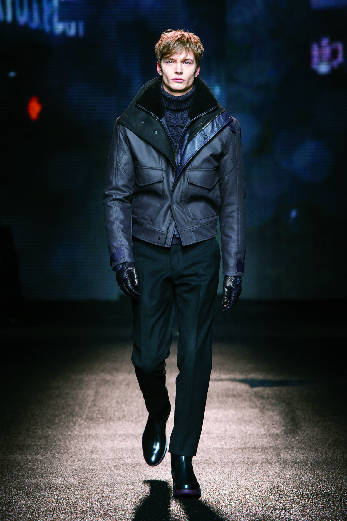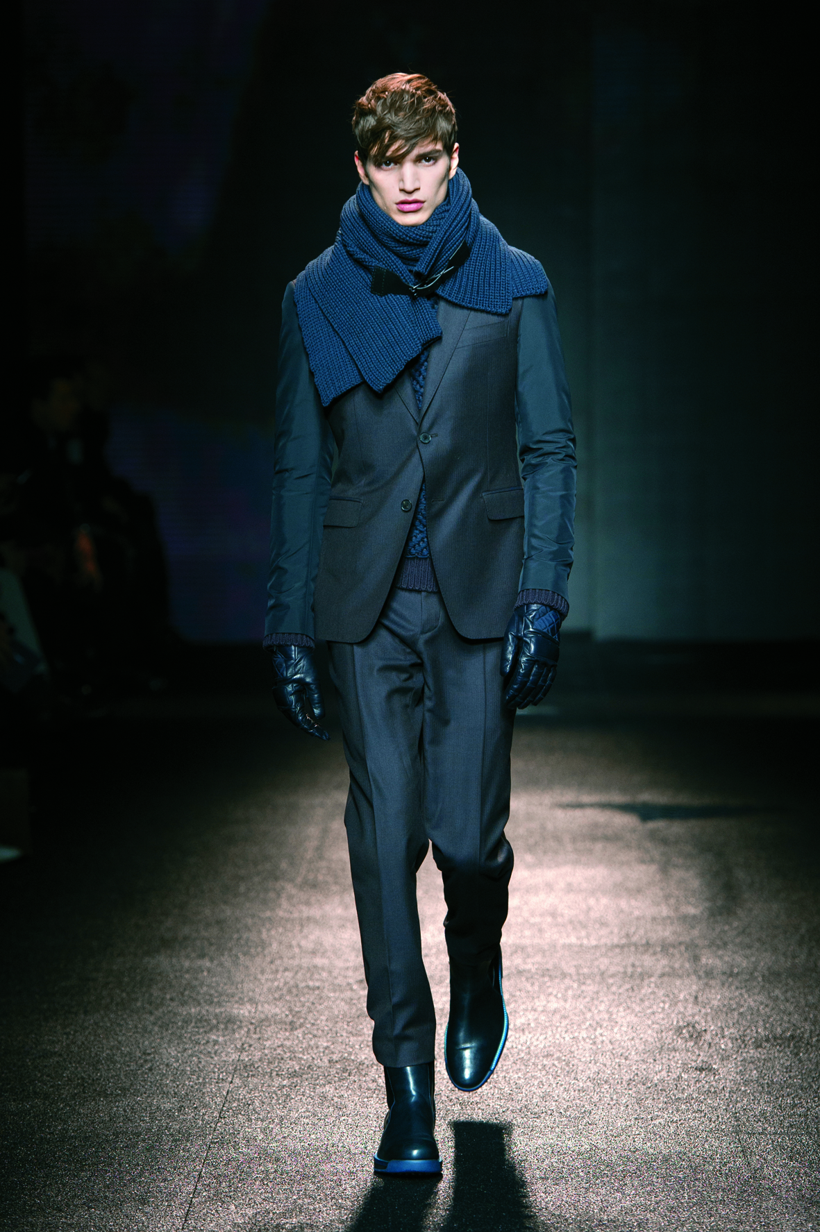 Le cuir étant donc le domaine dans lequel la maison excelle, on le retrouve tout au long de la collection : bandes et empiècements sur les manteaux et les capes, gants, bottines, mocassins. Même s’il reste classique, l’homme Ferragamo n’est pas pour autant désuet. En effet, mélanger bleu marine et noir avec goût s’avère être un de tour de force que la maison réussit sans encombre.