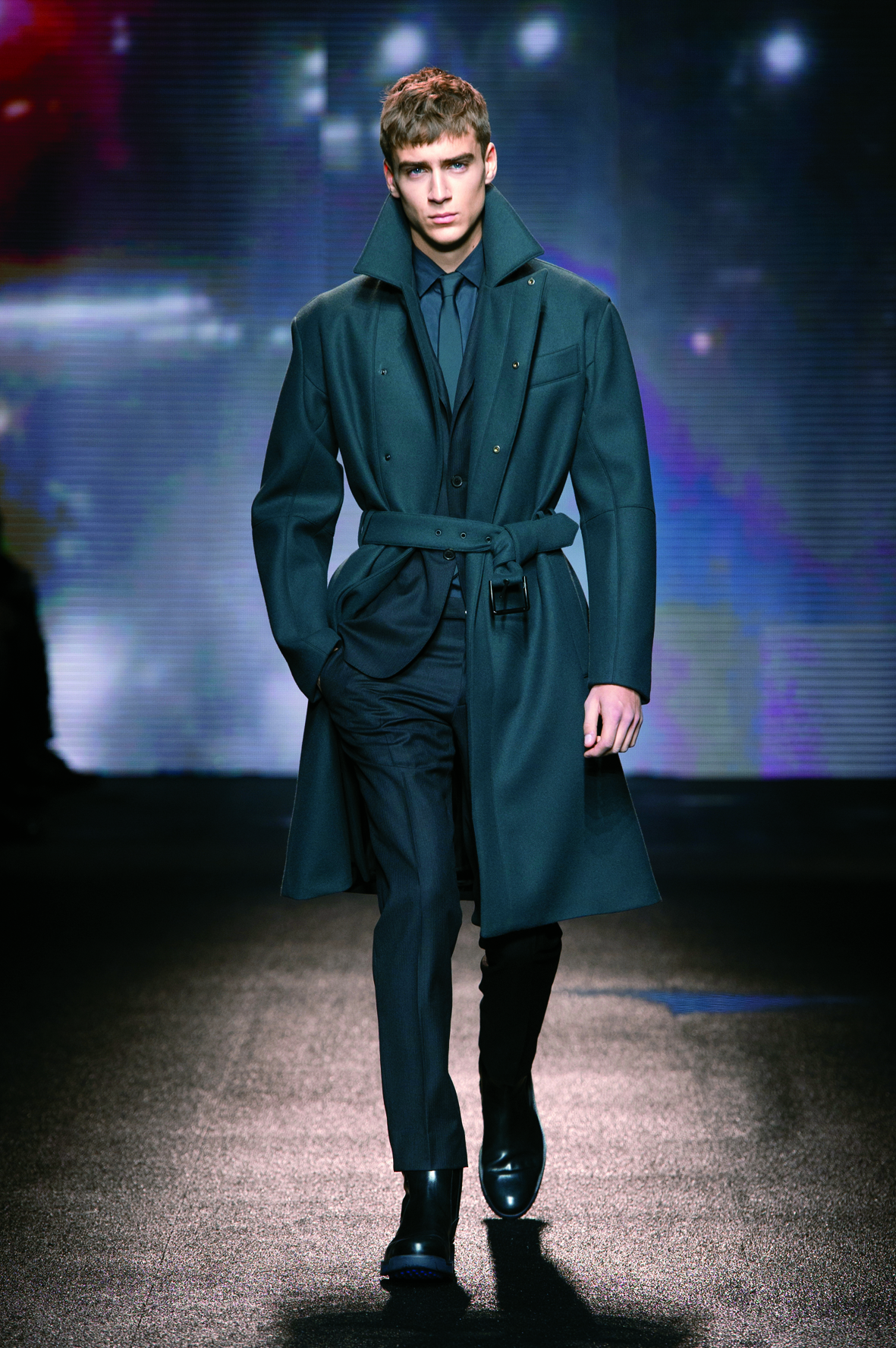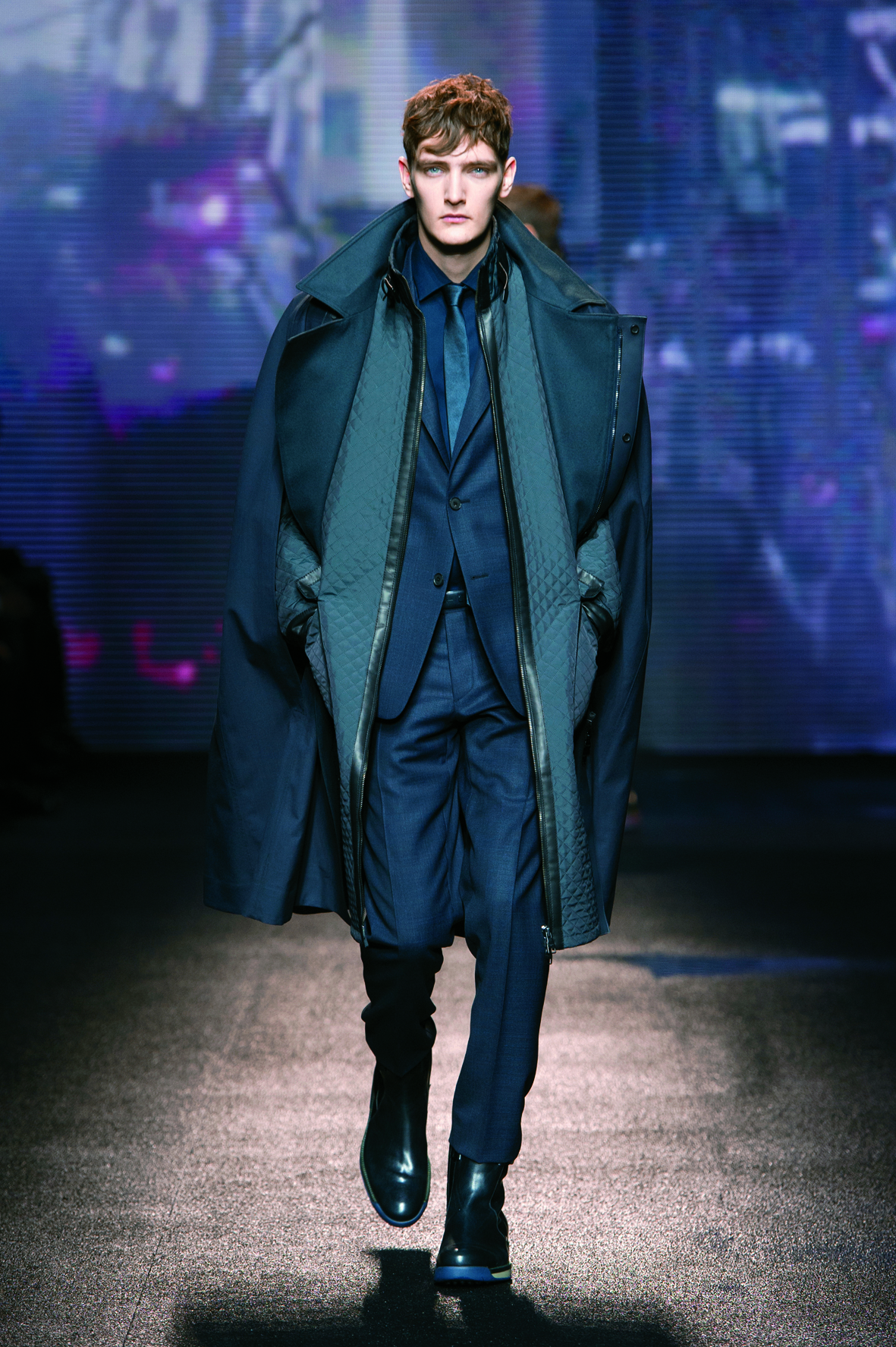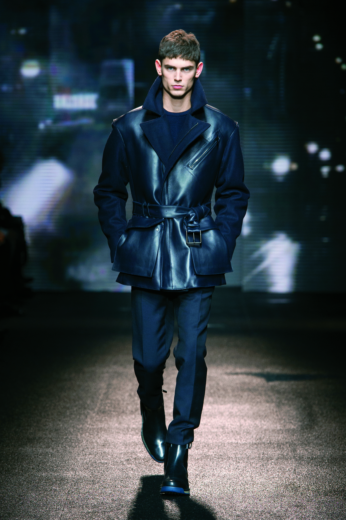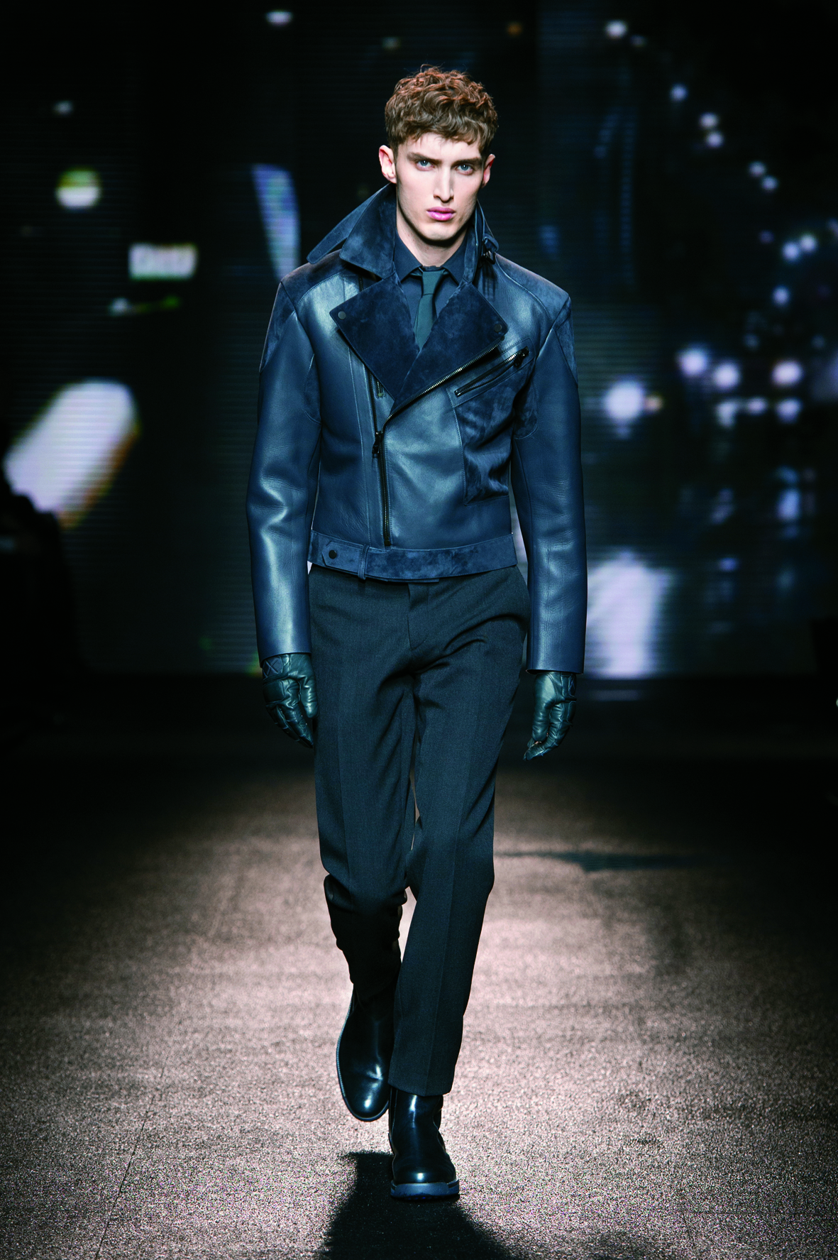 Le cuir étant donc le domaine dans lequel la maison excelle, on le retrouve tout au long de la collection : bandes et empiècements sur les manteaux et les capes, gants, bottines, mocassins. Même s’il reste classique, l’homme Ferragamo n’est pas pour autant désuet. En effet, mélanger bleu marine et noir avec goût s’avère être un de tour de force que la maison réussit sans encombre.