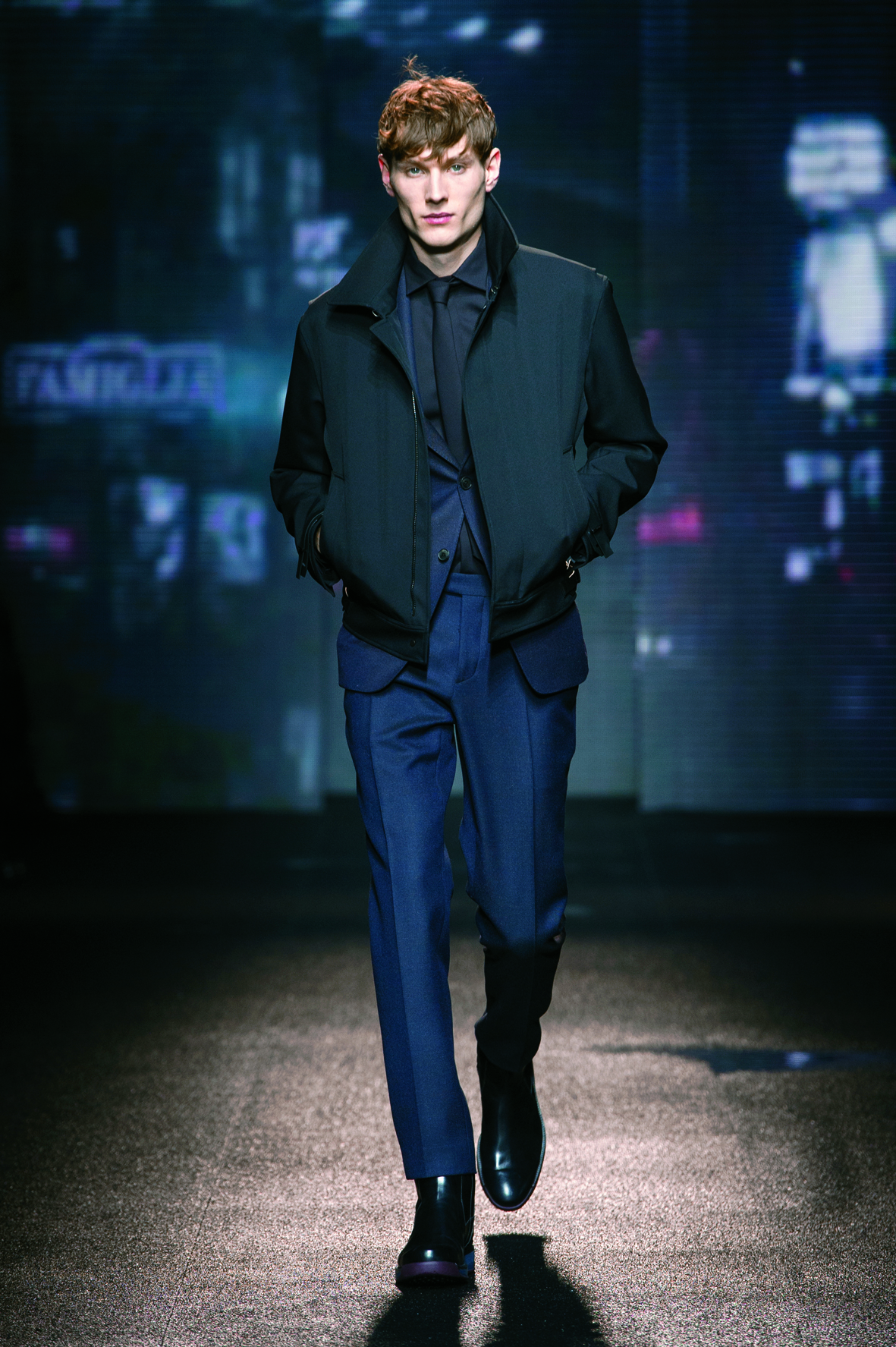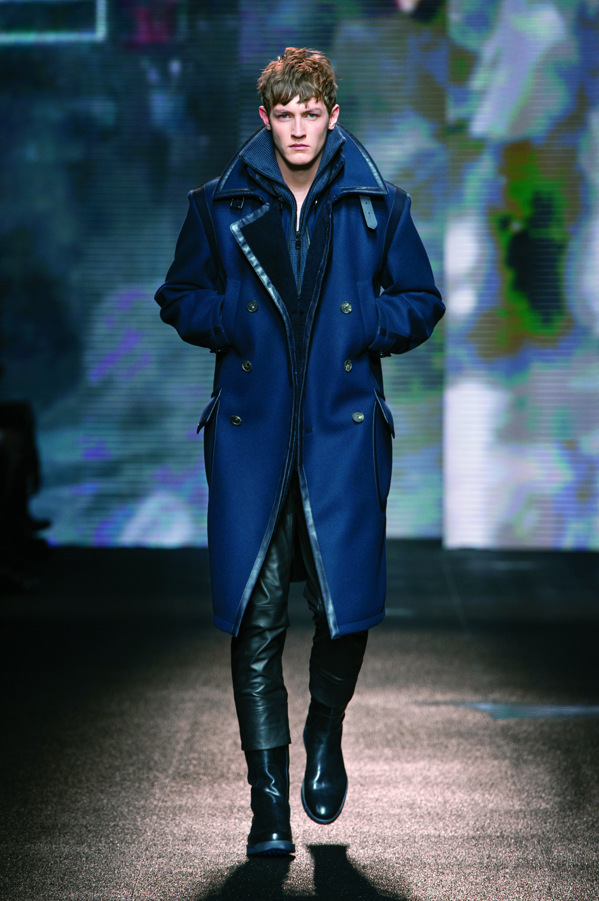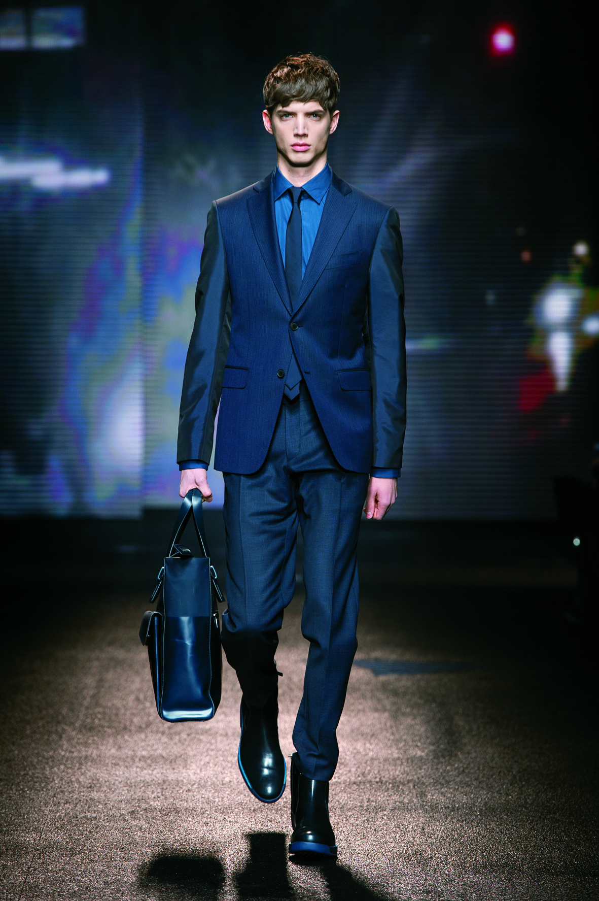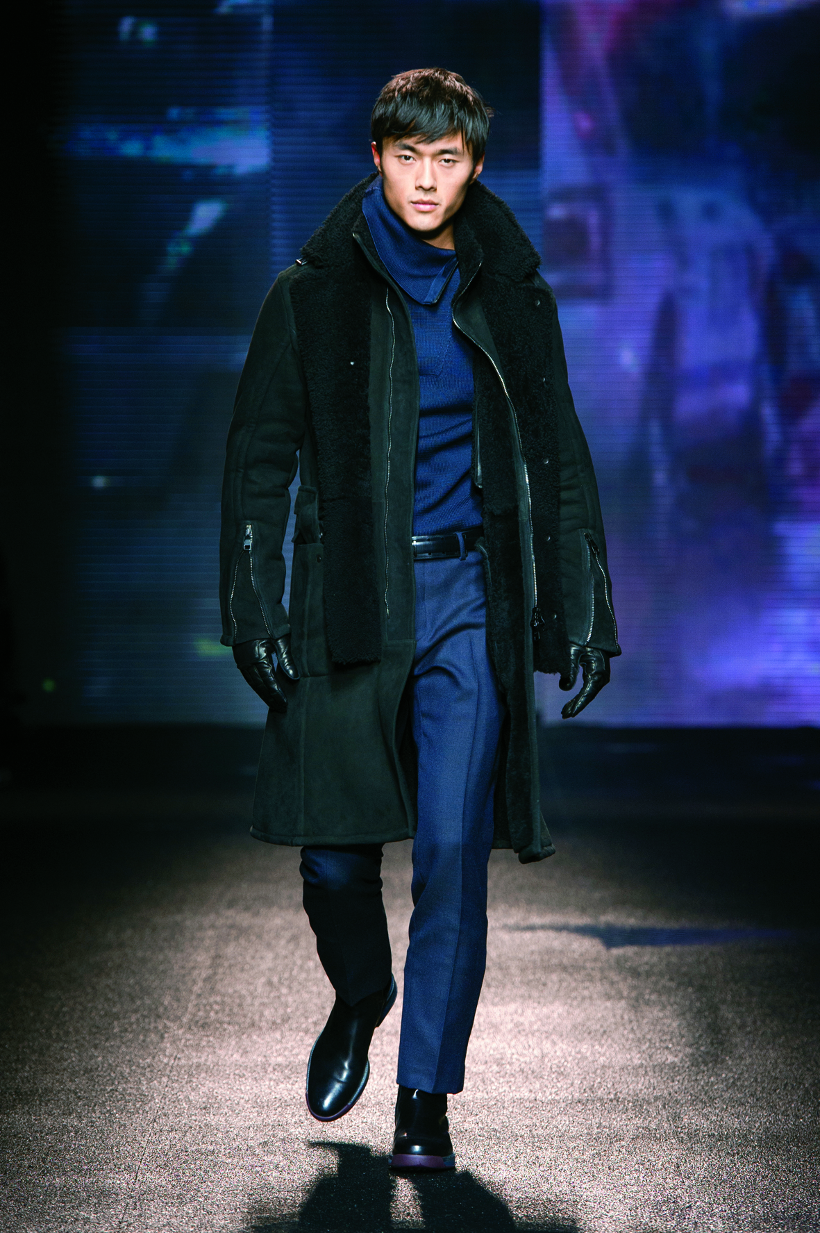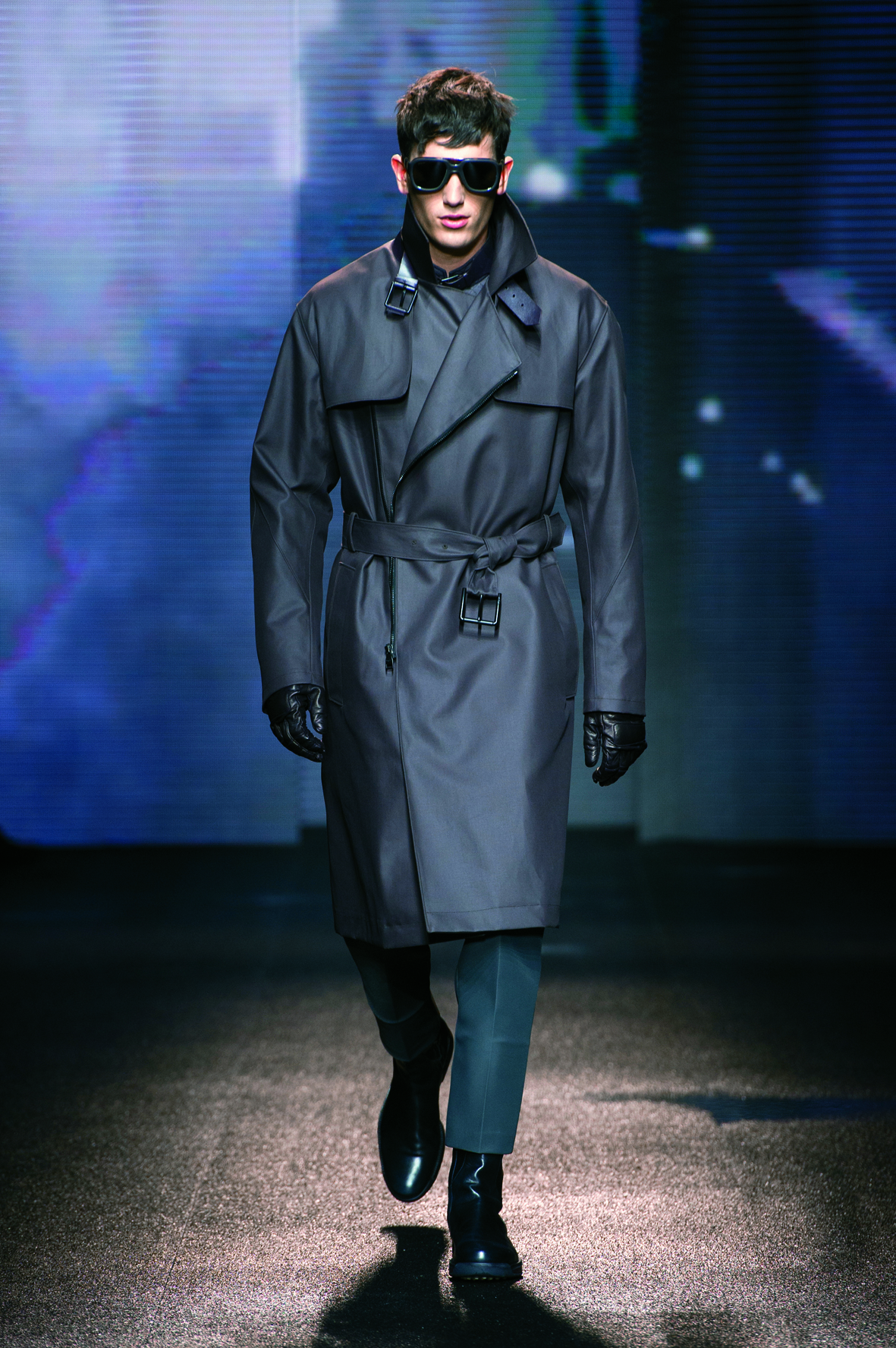 Le cuir étant donc le domaine dans lequel la maison excelle, on le retrouve tout au long de la collection : bandes et empiècements sur les manteaux et les capes, gants, bottines, mocassins. Même s’il reste classique, l’homme Ferragamo n’est pas pour autant désuet. En effet, mélanger bleu marine et noir avec goût s’avère être un de tour de force que la maison réussit sans encombre.