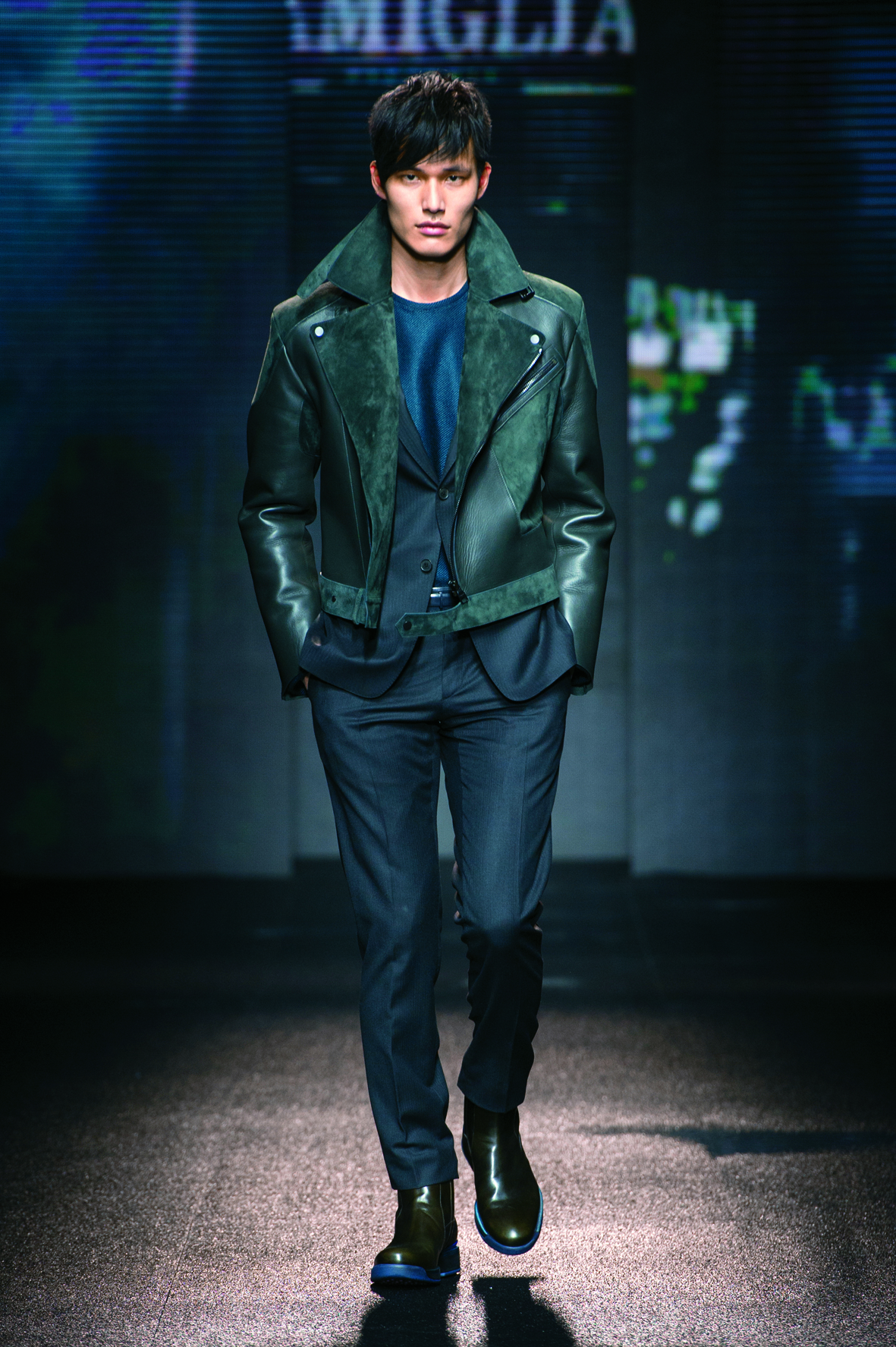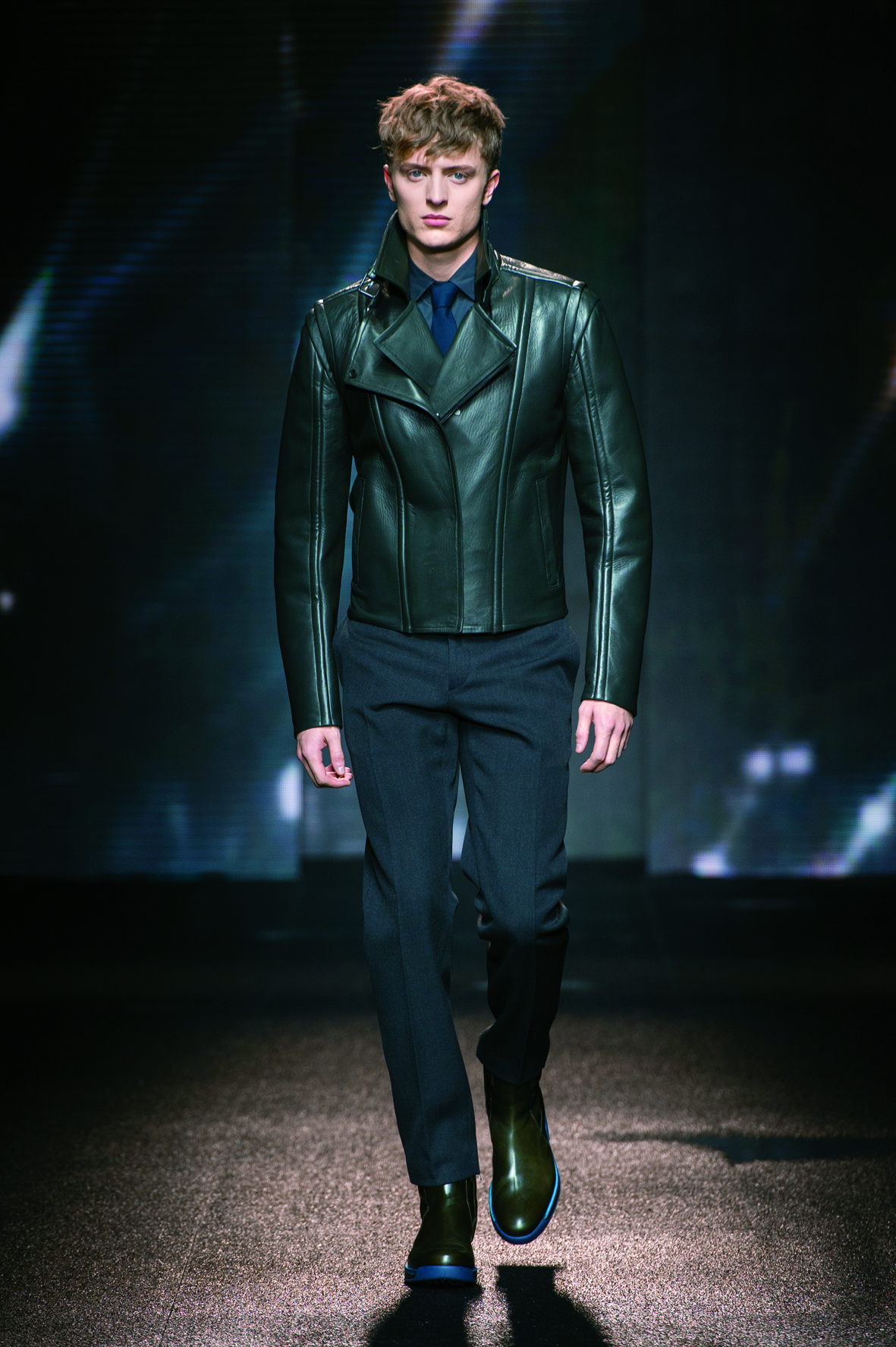 Et si l’on continue la comparaison avec la saison précédente, de sportswear ici, il n’est nulle question. Oubliées, les sneakers multicolores! L’homme chez Salvatore Ferragamo puise ses inspirations dans le streetwear à tendance rock avec les nombreux blousons et perfectos en cuir que l’on peut voir.
