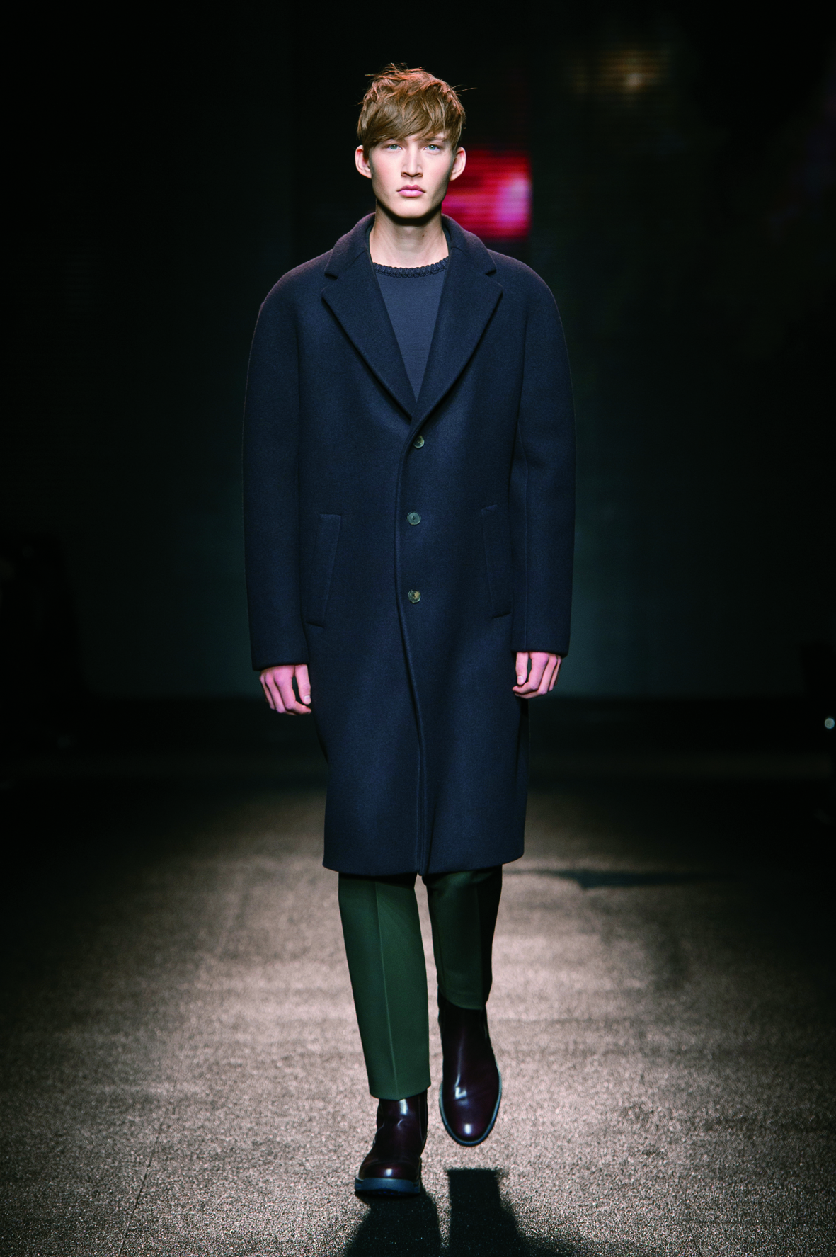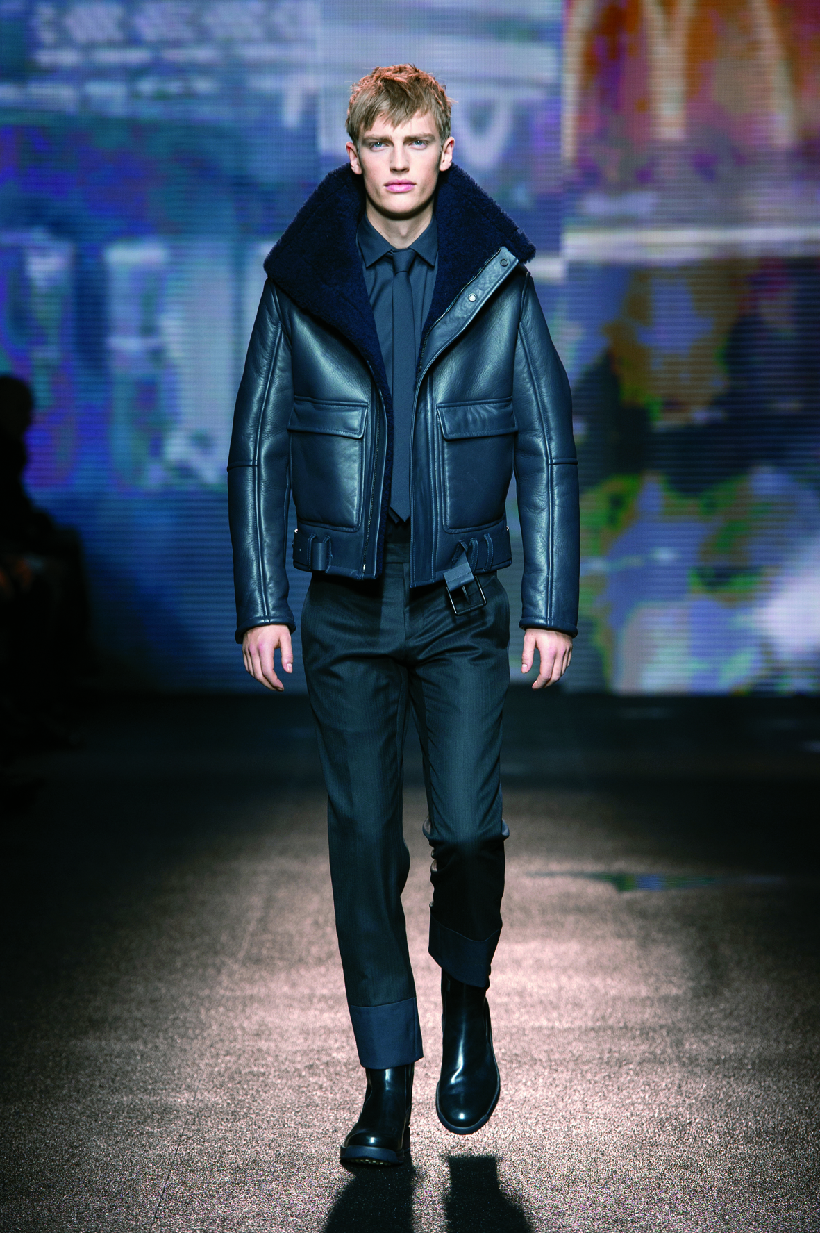 Nous avons à faire à une maison italienne, alors bien sûr, nous retrouvons quelques touches de fourrure ça et là (sur les cols, notamment). Au delà du cuir, les pulls en maille sont aussi très présents. Les cols semblent être le point de départ de la silhouette sur les manteaux et vestes car on remarque qu’une grande attention y est apportée (oversize, quand tu nous tiens!). L’ensemble reste cintré, carré, net et précis, capturant ainsi l’essence de l’homme chez Ferragamo et son élégance moderne sans ostentation.