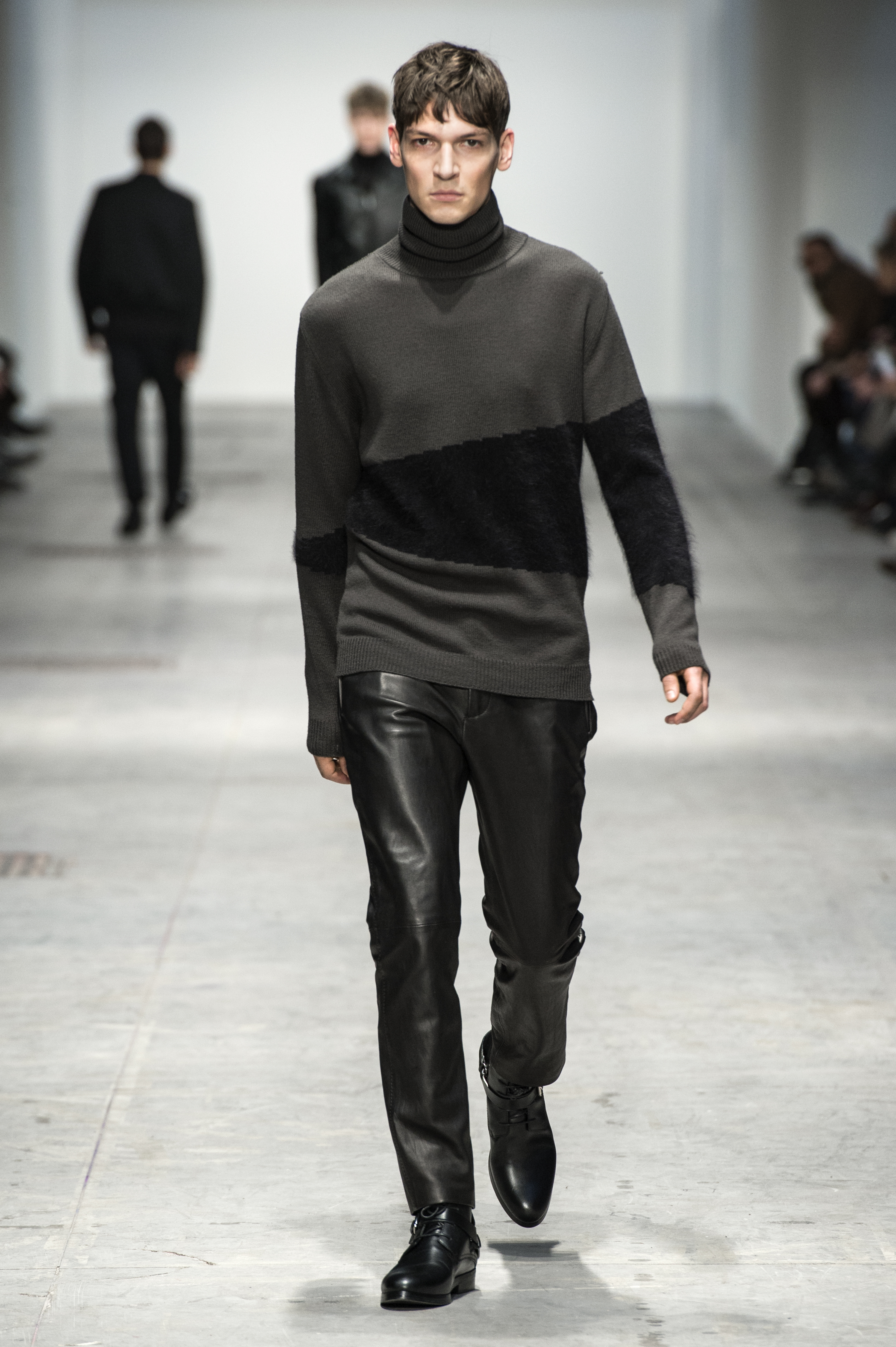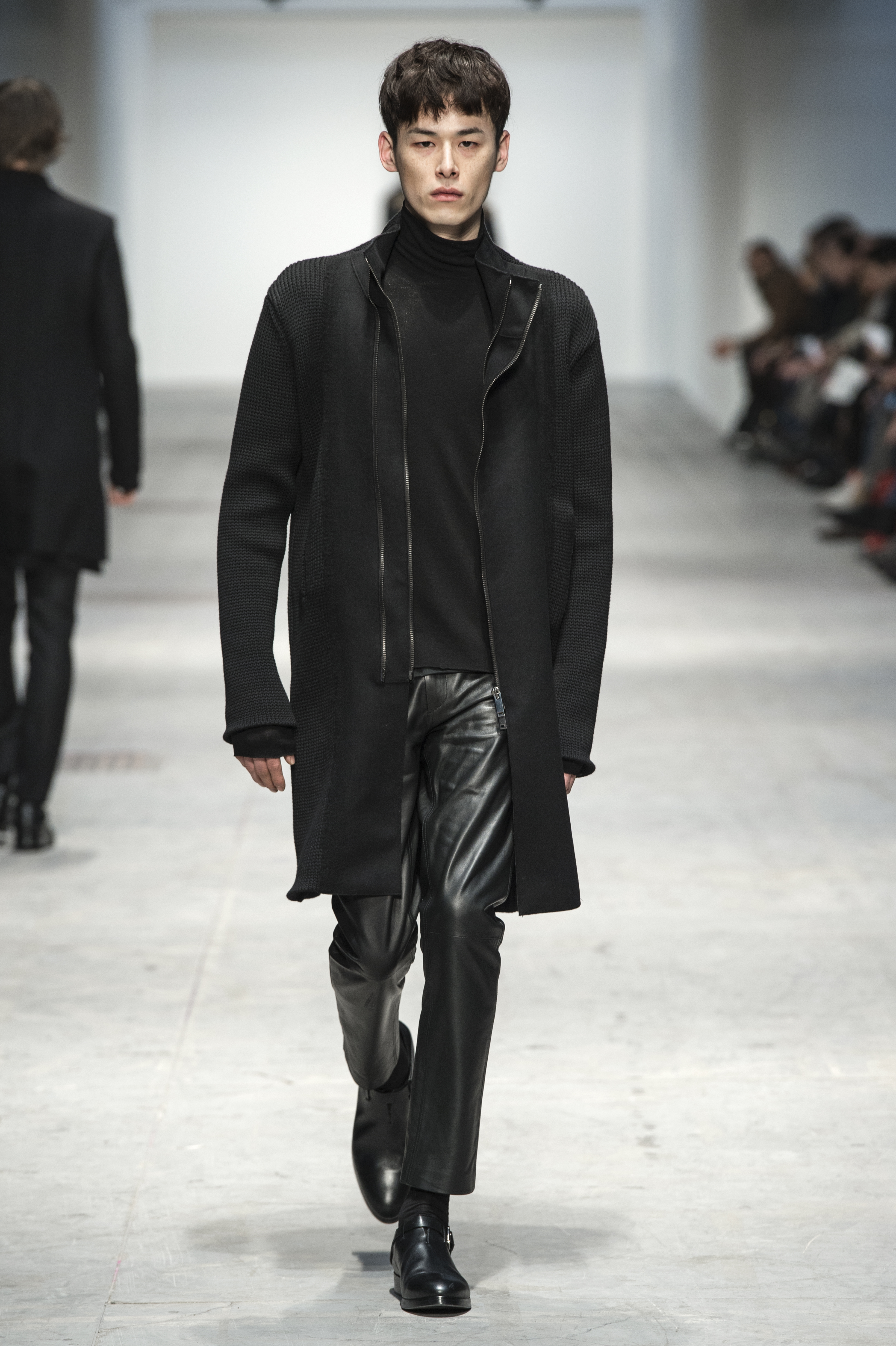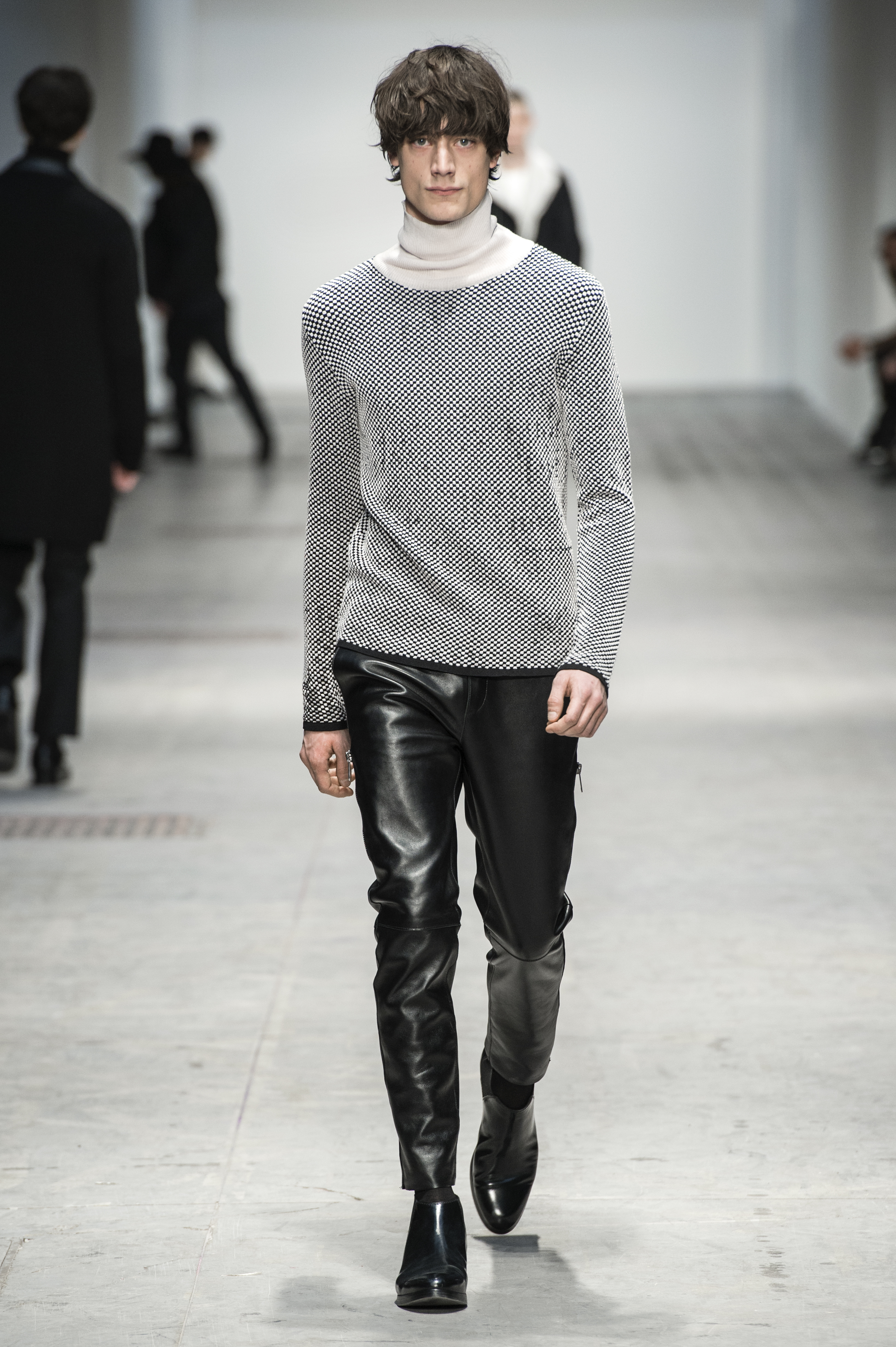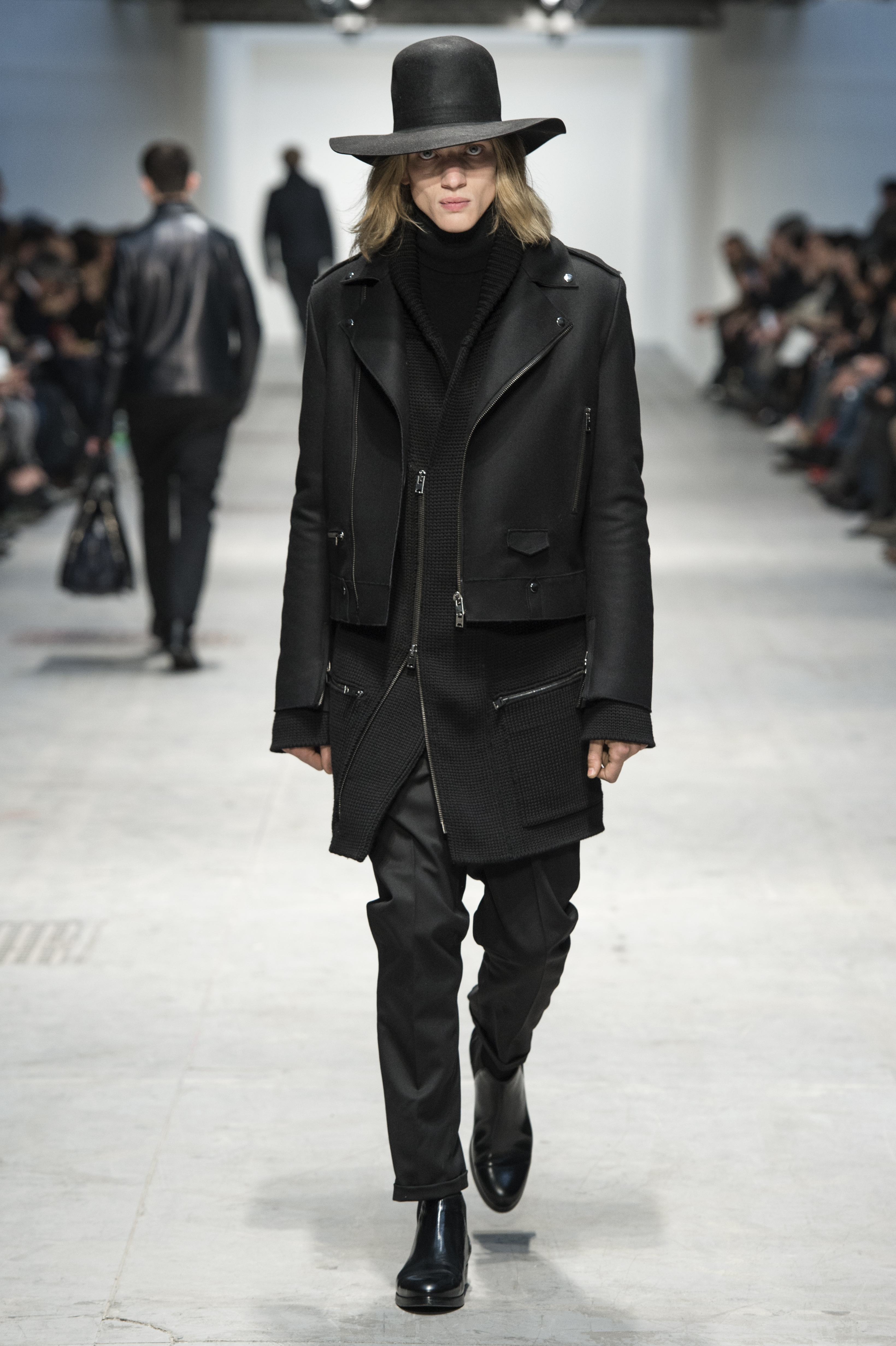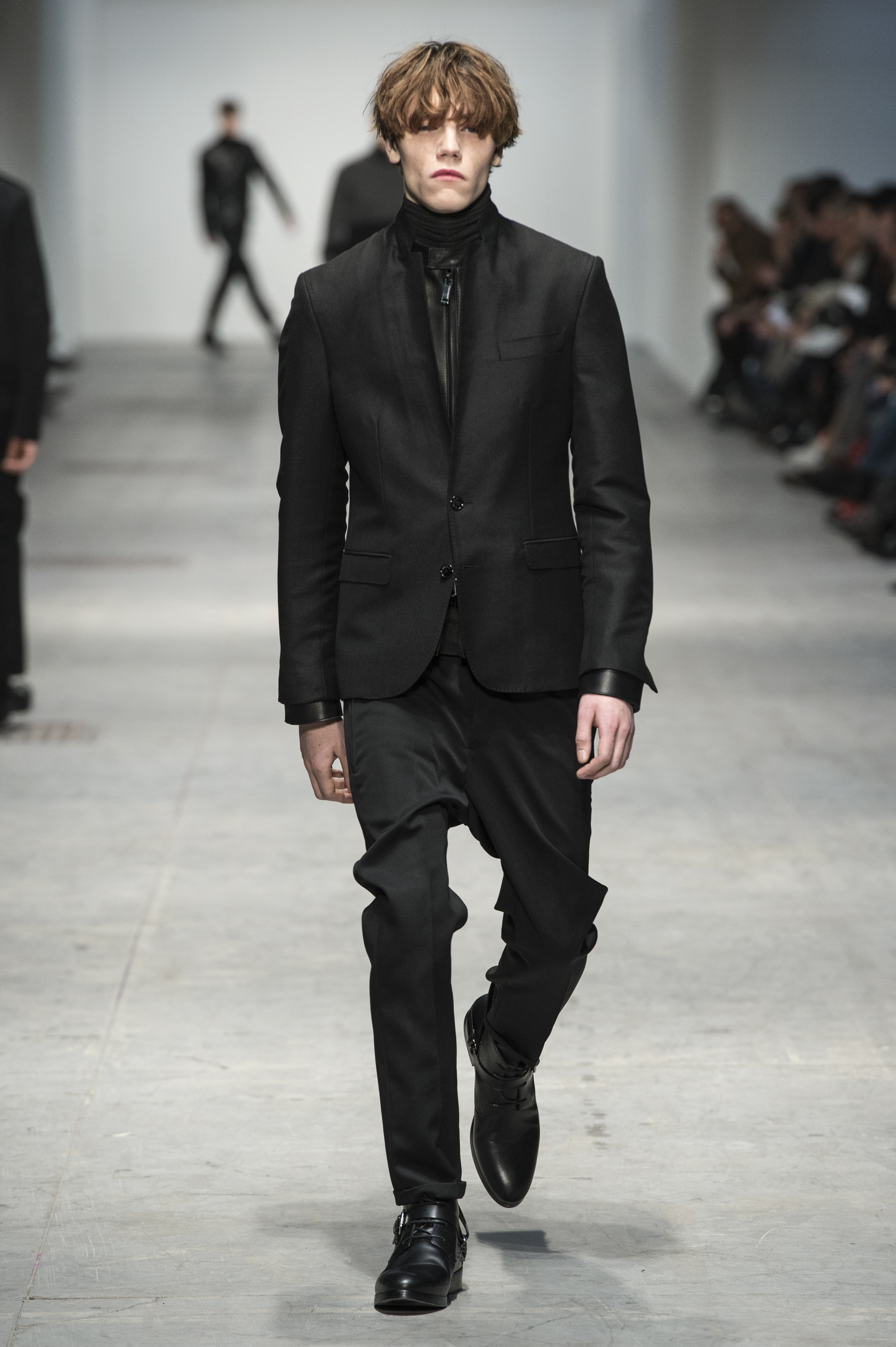 Alors oui le noir est omniprésent mais est-ce que cela rend la collection ennuyeuse ? Pas du tout! Le designer italien est passé maitre dans l’art subtil du mélange de matière et nous propose dès ses premiers looks de la laine mariée avec du cuir. Les zips sont partout, aussi bien sur les vestes que les manteaux et le créateur derrère CoSTUME NATIONAL s’amuse des longueurs et fait se recontrer ces deux pièces de la garde robe.