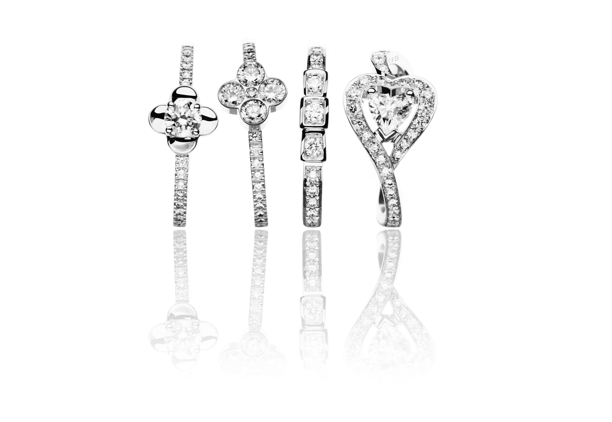 Les idéales aux fiançailles de diamants et d’or gris, avec les deux bagues Fleuri car nous avons tous une part d’enfant en nous, suivi de la Smoking Girl petit modèle, telle une fine ceinture pour enlacer l’annulaire et la Mini Crazy Heart le diamant au milieu d’un cœur.