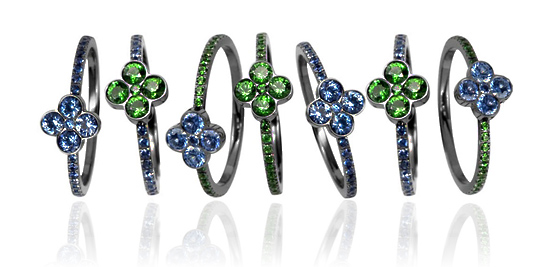 Une déclinaison Fleuri Bleuvertigo a été spécialement créée pour célébrer le printemps. En redonnant ses couleurs d’origine au myosotis emblème de la collection fleuri, de la grandeur du bleu à la profondeur vertigineuse du vert. Bagues et bracelets en or noir, saphirs bleus et tsavorites.