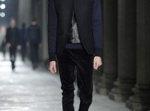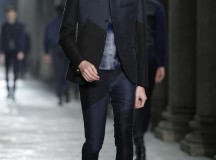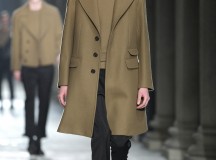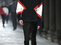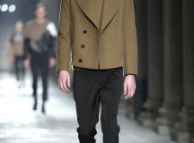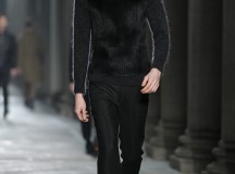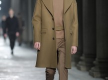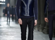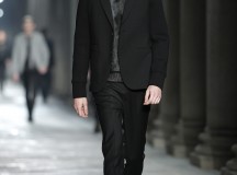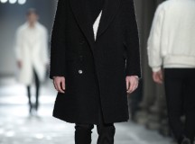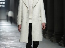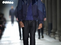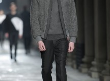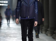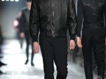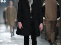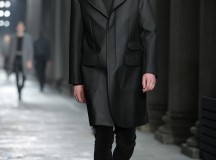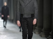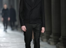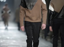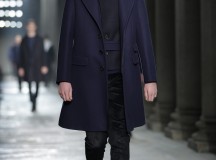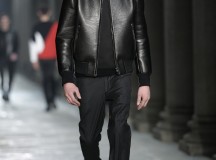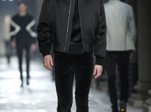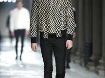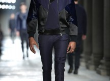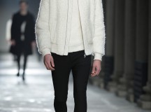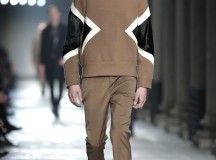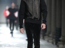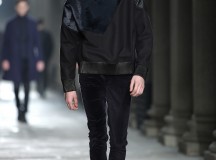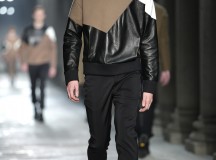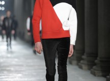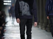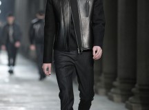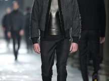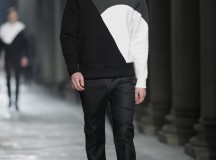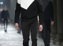 La simplicité ne semble pas être la seule notion empreintée au mouvement Bauhaus, on retrouve aussi toute la fonctionnalité au cœur de celui-ci. Bombers, pulls, manteaux ce sont des vêtements beaux et adaptés à l’hiver que propose Neil Barrett, sans tomber dans une aridité rigoriste qui rendrait la collection ennuyeuse. Ce que la palette de couleurs n’a pas en fantaisie, Neil Barrett le réinjecte dans les formes, le mélange de matière et les imprimés.