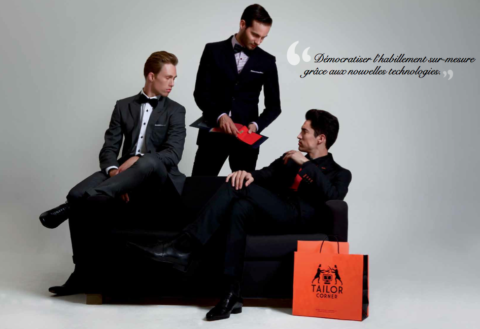 Lors de leurs études, fabien Barrois et mehdi Cheddadi ont développé une véritable sensibilité pour la mode masculine, et ont décidé de s’y investir en utilisant les technologies qu’ils maîtrisent. Après de nombreuses études de marché et analyses de la demande, ils parviennent à la conclusion que beaucoup d’hommes aimeraient s’offrir des vêtements sur-mesure au prix du prêt-à- porter. L’esprit visionnaire de nos deux jeunes entrepreneurs et leur maîtrise des nouvelles technologies va leur permettre de bâtir les fondements de Tailor Corner. Pour parvenir à leurs fins, l’un et l’autre consentent beaucoup de sacrifices personnels et assurent une masse de travail colossale pour lancer la marque. L’équilibre est solide, l’association entre nos entrepreneurs fructueuse. Et en 2010, l’obtention du Grand Prix Unibail-Rodamco des Jeunes Créateurs du Commerce distingue leur travail, le concept et lance officiellement la marque Tailor Corner. Et aujourd’hui, c’est le temps de la croissance et de l’ouverture de webstores dans les centres commerciaux. Une juste récompense pour ces deux hommes qui promettent avoir d’autres cartes maîtresses dans leurs manches pour créer de nouveaux produits à forte valeur ajoutée pour tous les autres hommes !