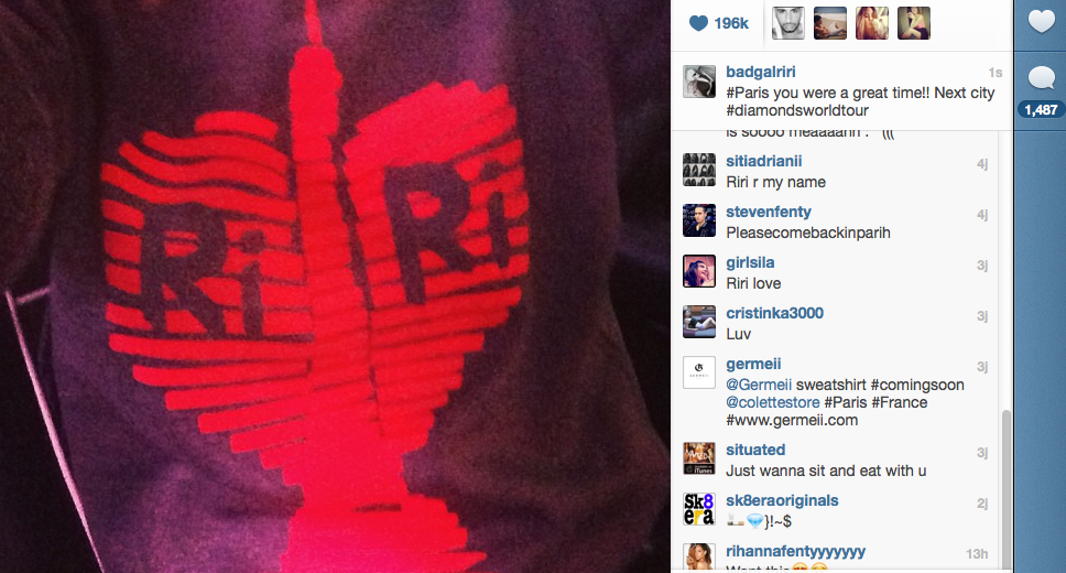 La marque parisienne Germeii créée en 2010 à une devise « spiritualise ton style ». Germeii réinvente le t-shirt en le pavoisant de vos lyrics préférés et de visuels résolument minimaliste et chic au style intemporel . Le créateur Shamim véritablement inspiré, met un point d’honneur à participer à chaque étape de l’élaboration des visuels jusqu’à la moindre facette qui compose sa marque. Une marque qui a opté pour la qualité bien de chez nous, labellisée Made in France. En à peine un an Germeii connait un succès international de Paris à Monaco en passant par les États-Unis et le Japon. La marque a déjà été adoptée par de nombreux artistes internationaux du monde de la musique et du cinéma. La chanteuse qu’on ne présente plus Rihanna lors de son passage à Paris pour son concert au Stade de France le 6 juin, a elle aussi craqué pour la collection Germeii. Postant sur son compte Instragram son pull RIRI toute dernière création de la marque, ce qui en moins de 2h déclencha plus de 120 000 likes.