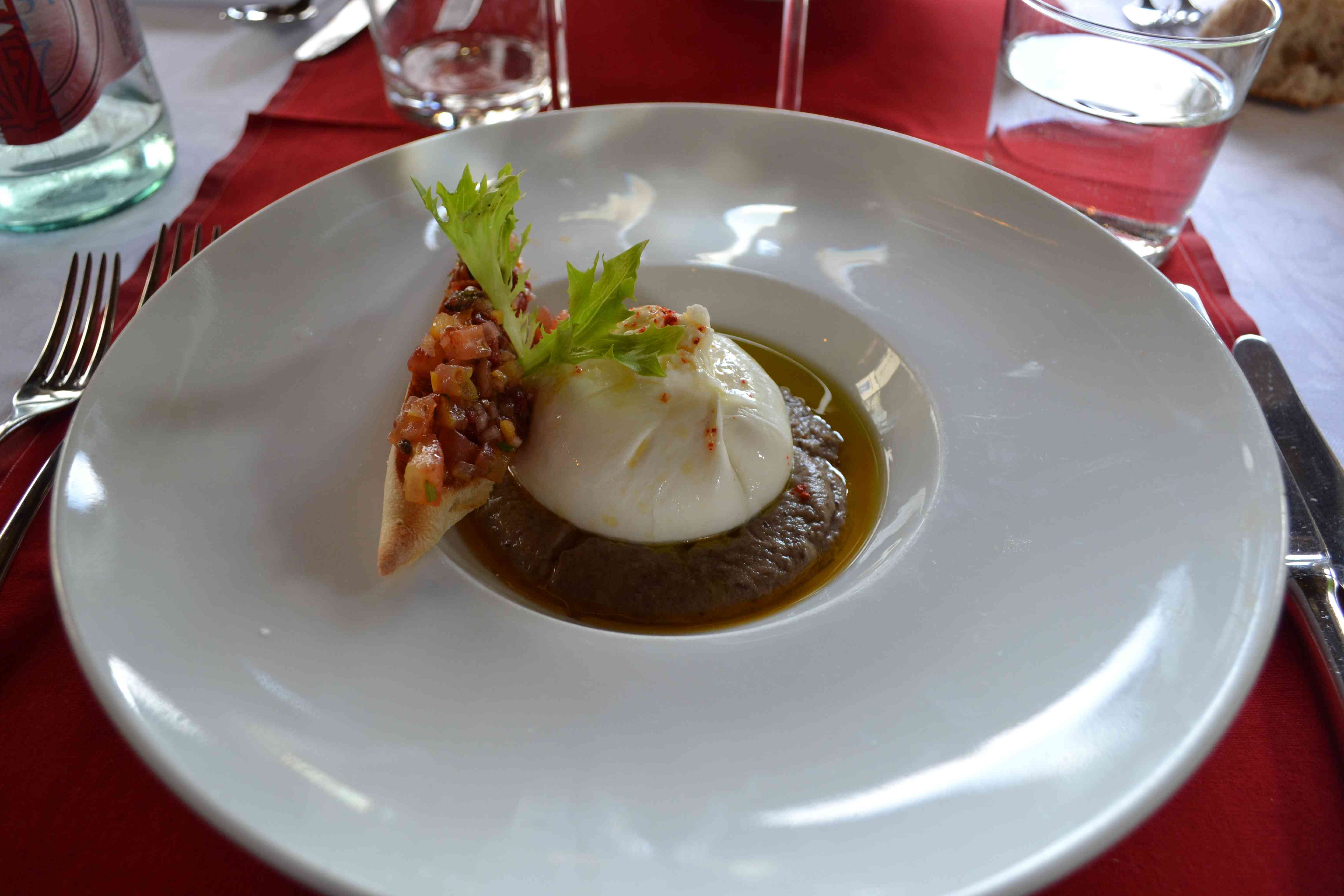Aux fourneaux, on retrouve le chef Rémi Chambard. La carte au choix relativement limité, n’empêche pas d’avoir du mal à se décider. En entrée, on hésite entre du Foie Gras, un gaspacho de petits pois et menthe … On opte finalement pour une « Burrata » avec son huile d’olive et son caviar d’aubergine. Un mariage heureux et mozzarella vraiment laiteuse.
