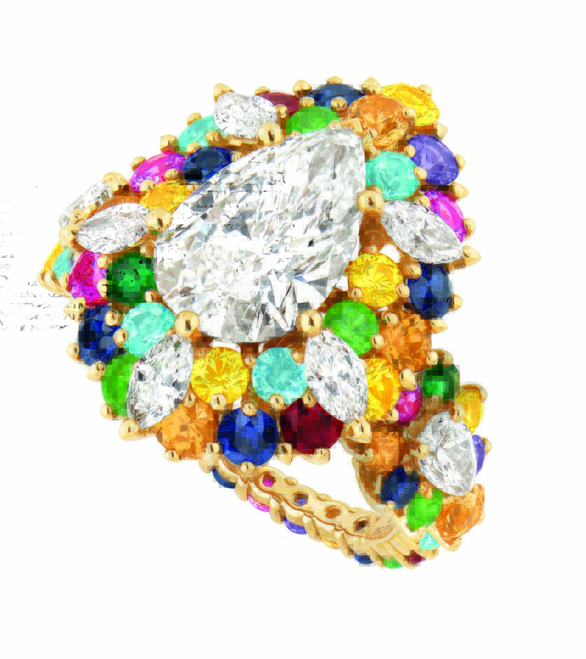 Créatifs et minutieux, les sertis permettent alors d’exprimer toute la richesse de la palette de couleurs de Victoire de Castellane : en dégradés, en camaïeux, contrastées, voire éruptives, tel un feu d’artifice.