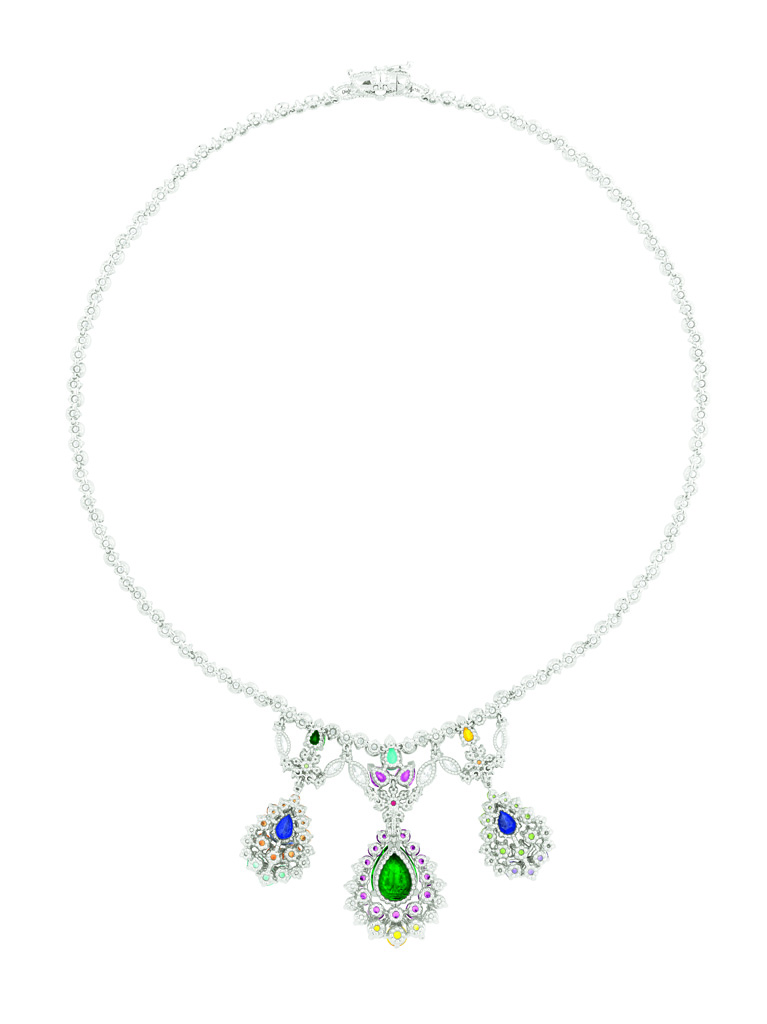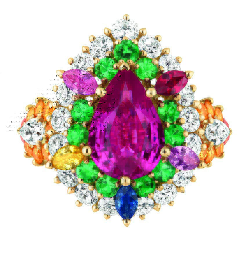 « Très cher Christian », ainsi pourrait commencer la lettre de Victoire, tant sa collection Cher Dior lui rend hommage. Et de lui parler ensuite de leur passion commune : la couleur. « Les rouges vifs – l’écarlate, le rouge anglais, cramoisi ou cerise – sont pleins de jeunesse et de gaieté, écrivait Christian Dior dans son Little dictionary of fashion. Il en existe un pour chaque femme. » Ou, un peu plus haut : « Lorsque vous choisissez un bleu, faites attention à le regarder aussi bien à la lumière du jour qu’à la lumière électrique, car il peut paraître différent. » Choisir les nuances, harmoniser les teintes, les assortir ou au contraire les entrechoquer, ce talent du couturier, Victoire de Castellane aussi le maîtrise. Et les couleurs se répondent : rouges et bleues, les soieries et les étoffes d’alors deviennent rubis et saphirs. Comme pour toutes les collections, mais encore plus particulièrement pour celle-ci, c’est tout un travail sur la couleur que la subtilité des pierres met en avant. Diamants, grenats spessartites, grenats démantoïdes, tourmalines Paraïba, rubis, émeraudes, et tout un dégradé de saphirs, du jaune clair au jaune intense, du bleu pâle au violet profond, en passant par toutes les nuances de rose.