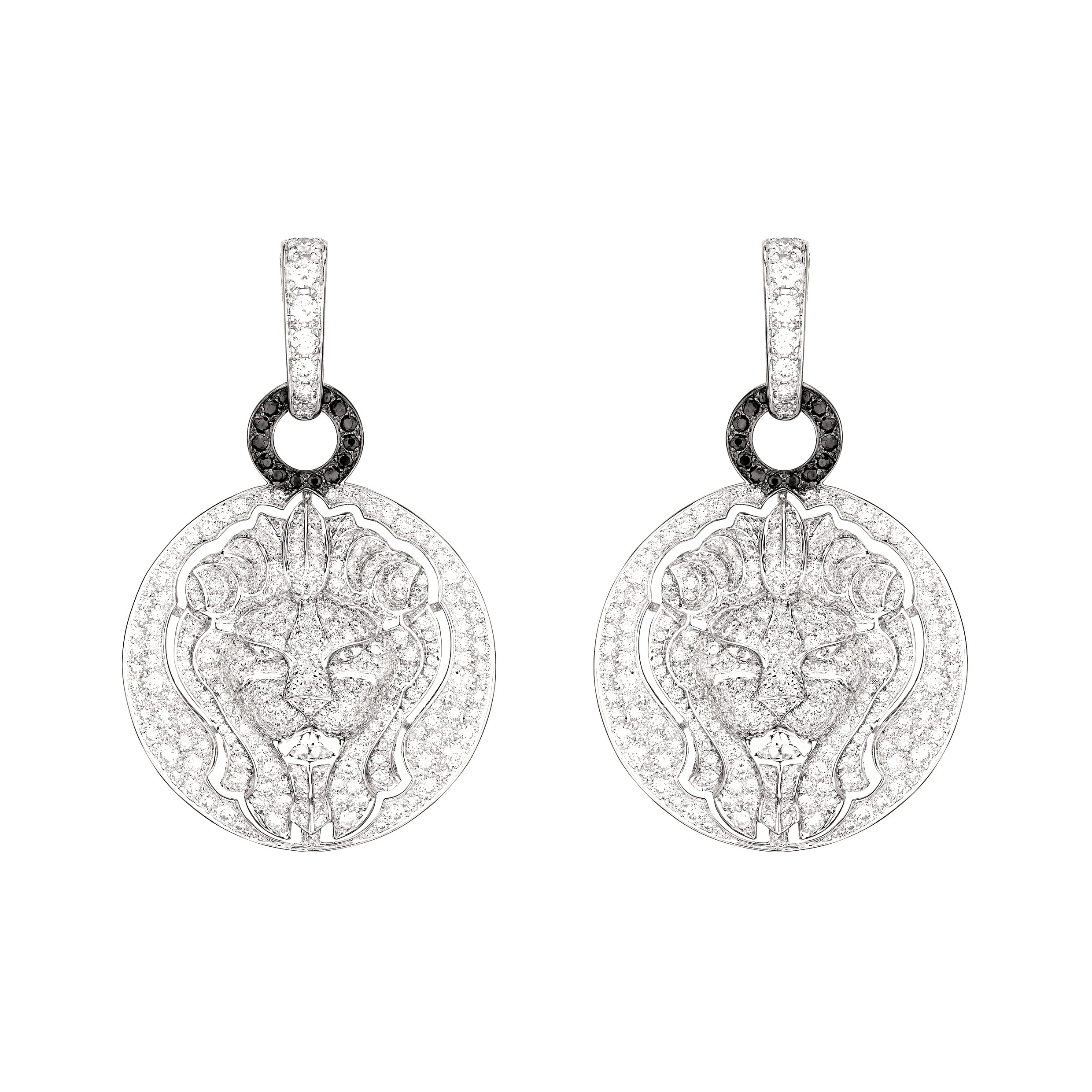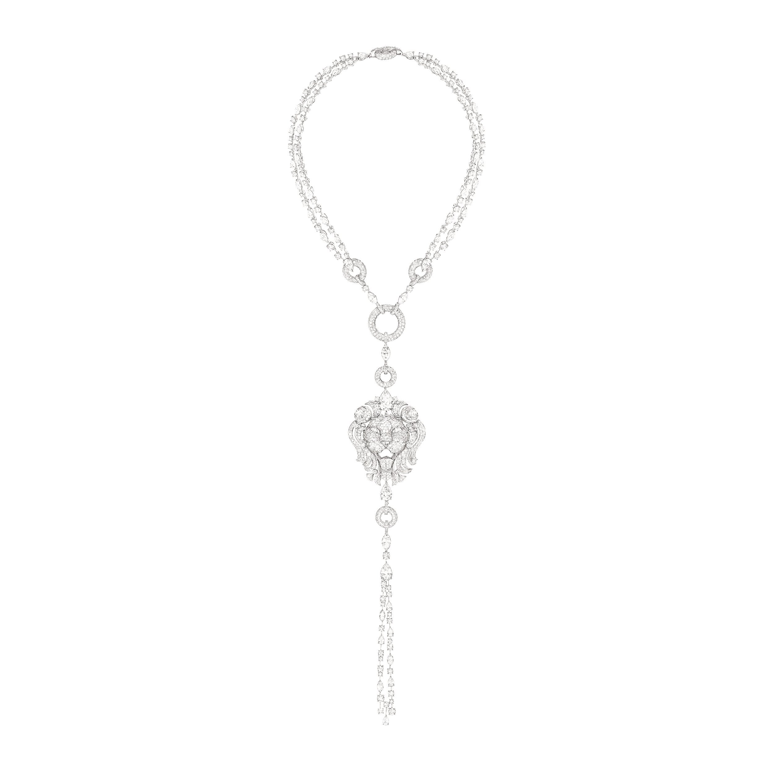 Création phare de cette collection, la parure « Lion Royal » en platine, or blanc et diamants, met en lumière toute la somptuosité du motif. Un spectaculaire collier transformable, entièrement serti de diamants se porte en version sautoir ou collier plus court, le motif central figurant une tête de lion peut également devenir une broche. Une paire de pendants d’oreilles, ainsi qu’une bague, déclinent ce même thème.