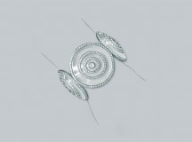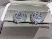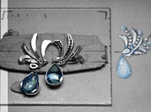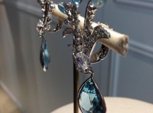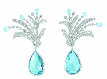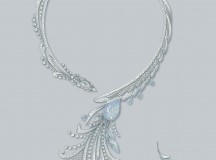 La parure Paon de Lune mêle harmonieusement diamants, cristal de roche, aigue marine et météorite. Oscillant entre le bleu ciel et des reflets bleu-vert très pâles, les gouttes en aigue marine sont comme les ocelles d’un oiseau couleur de lune. De part et d’autre, les diamants baguettes et les diamants ronds ont été taillés un à un pour suivre la courbe du plumage. Les lunes de cristal de roche légèrement bombées donnent du relief aux ailes qui semblent prêtent à s’envoler. Dans ce nuancier, la météorite est un coup d’éclat. Tombée directement d’une planète, cette pierre entre ciel et terre aurait plus de 4 milliards d’années d’existence.