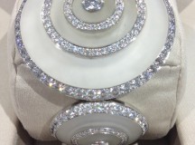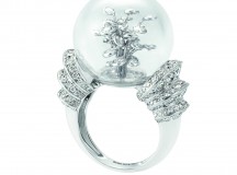 Autre défi de taille : le joaillier a recréé une véritable vie à l’intérieur du cristal. Des éclats de diamants ont été emmaillés sur un socle en cristal de roche, sans recourir au métal, à la différence de la joaillerie traditionnelle. Ainsi les diamants semblent flotter dans trois sphères de cristal, telles trois constellations d’étoiles et de planètes dont le diamant rond central serait le soleil. A cette impression de magie, s’ajoute l’éclat des slices d’or pavés de diamants qui est une signature de la Maison. Boucheron a inventé ce savoir-faire en 1900 en intercalant entre chaque perle d’un collier un disque de diamant taillé (appelé « slice ») afin de rendre le collier plus précieux.
