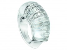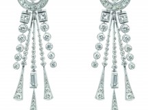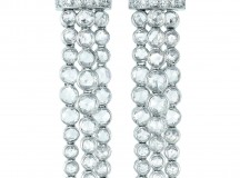 Le même pouvoir de fascination et de transparence agit sur les sens lorsqu’on regarde la parure Cascade de Diamants qui célèbre le mariage du diamant et du cristal. Des motifs de diamants ronds et baguettes sertis relient entre eux dix éléments de cristal évidés qui dessinent une courbe. Comme par un effet de crescendo, les éléments de cristal sont de plus en plus grands et les fragments de diamants de plus en plus espacés au fur et à mesure que l’on se rapproche du visage. A l’intérieur, ce flot de champagne est représenté par des diamants qui sont d’abord cachés par le cristal de roche dépoli puis révélés grâce au polissage du cristal à la fois extérieur et intérieur, geste très délicat à réaliser. Les flots de diamants taille rose sont soudés sous le motif en diamants puis se métamorphosent en une cascade de diamants ronds de taille différente qui se déverse à ciel ouvert en toute liberté. Par cet extraordinaire jeu de dégradés, cette cascade de champagne se transforme en cascade de lumière.