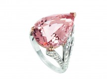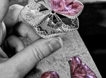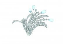 Au bout d’une tige pavée de diamants ronds, une fleur en or blanc se déploie en neuf pétales pavés de diamants sertis neige tout en volume et en superpositions. Au centre, les pistils de diamants sertis clos mis en valeur par des fils d’or recouverts de billes d’or ultrafines révèlent un ajourage d’une extraordinaire finesse. Sous elle, une autre se détache pour pouvoir se porter en broche, qui figure l’ombre de la première. Elle est tantôt transparente et rose en tourmaline sculptée comme la rosée du matin, tantôt opaque et grise, en nacre, comme la montée du soir.