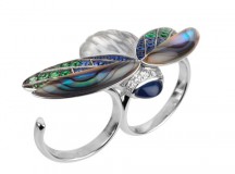 Boucheron est célèbre pour son précieux bestiaire. Parmi eux, les insectes sont chers au cœur de la Maison, comme le savait si bien Françoise Sagan qui les qualifiait de « messagers » et les collectionnait. Ces émissaires aériens, compagnons du jour et du soleil, donnent lieu à d’extraordinaires jeux de lumière et de transparence dans cette nouvelle collection, tant par les matières que par les dégradés de couleurs et de gravures.En témoignent des mélanges lumineux de cristal de roche ou de tourmaline translucides sculptés en forme de godrons, des opales taillées en forme de navettes, des nervures gravées dans les « slices » de nacres translucides, des têtes en forme de cabochon ou de pierres facettées ou encore des ajourages sertis sur fonds de nacre dont les dégradés de couleurs réfléchissent les teintes des ailes. Les pierres aux couleurs intenses ou à la transparence éclatante tels que saphirs, citrines, rhodolites ou tsavorites restituent à leur tour les incroyables dégradés des créatures ailées.