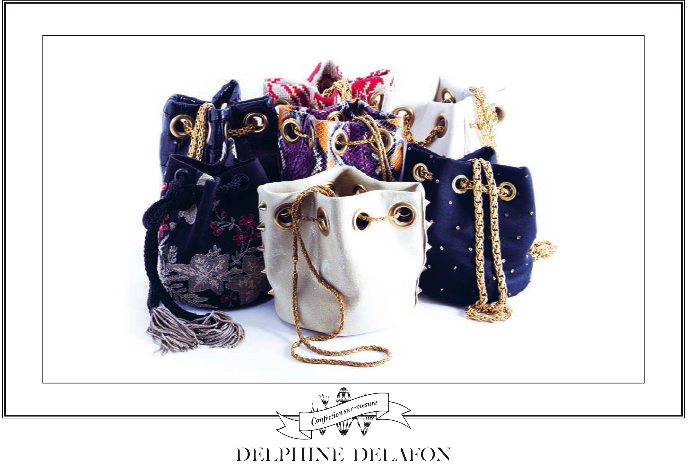 Delphine Delafon se jouent des codes et réinvente ses collections dans un esprit sur mesure en fonction des saisons, de ses envies et des matières qu’elle chine elle même. Tissus, cuir, reptiles, paille… magnifiés par les clous, les franges, les grigris… Avec toujours le même format « sceau », une chaine et l’œillet gravé et numéroté.