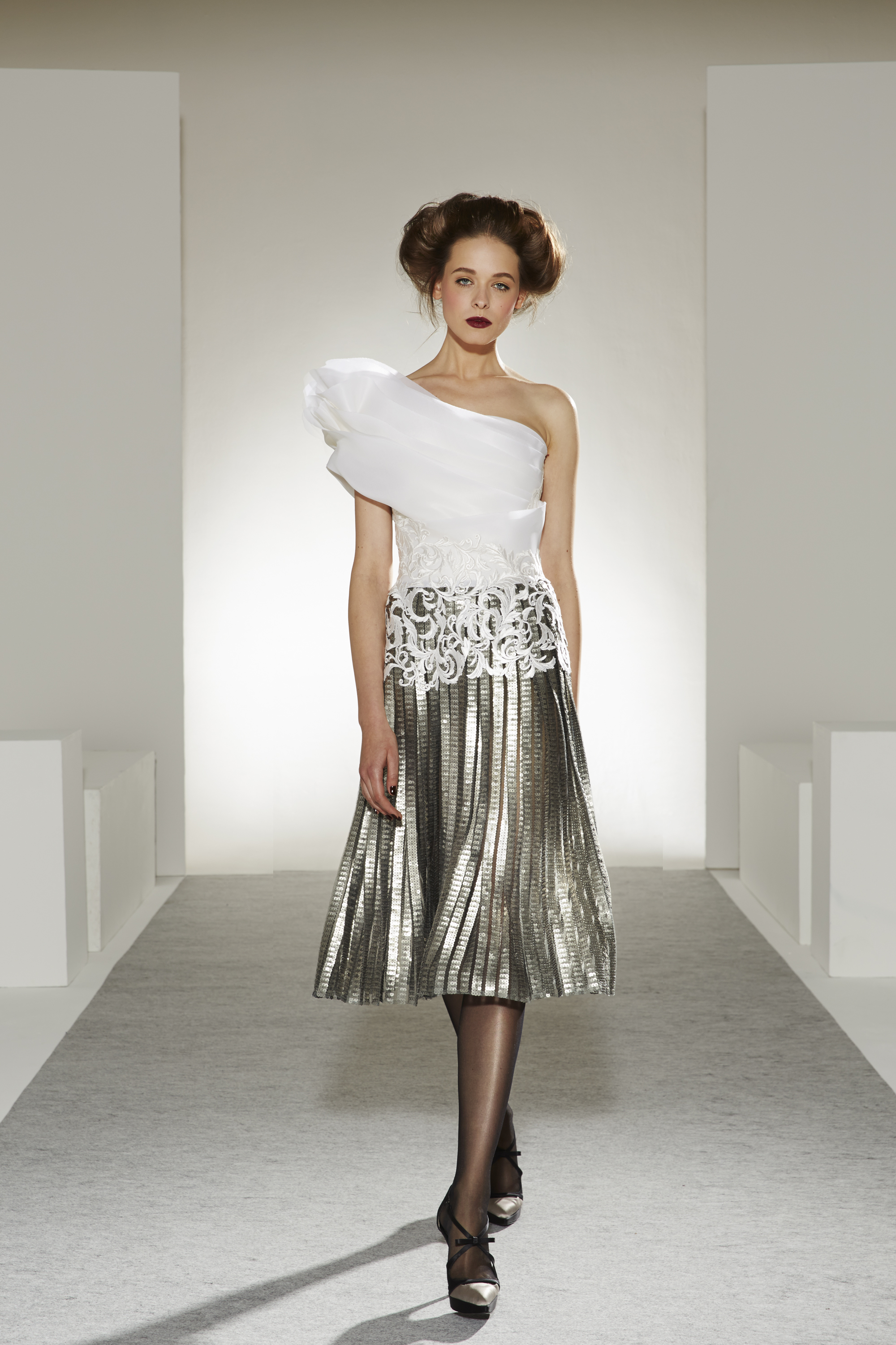Bonnes ondes : voiles de tulle et de nostalgie, miroirs de paillettes et glamour, filtres solaires ou lunaires de perles et broderies, patines d’or et de dentelles, feuilletés graphiques, arabesques de guipure, face à faste de fleurs et motifs Art Déco, Attraits d’organza, sillons de satin rayonnant… La silhouette s’enlace de ce qui l’enchante et lui fait du bien, aura d’ornements empreints de références familières.