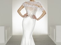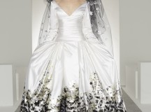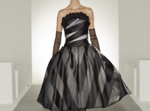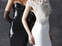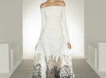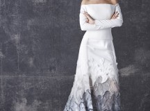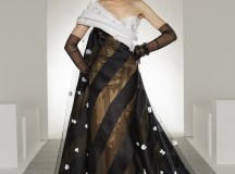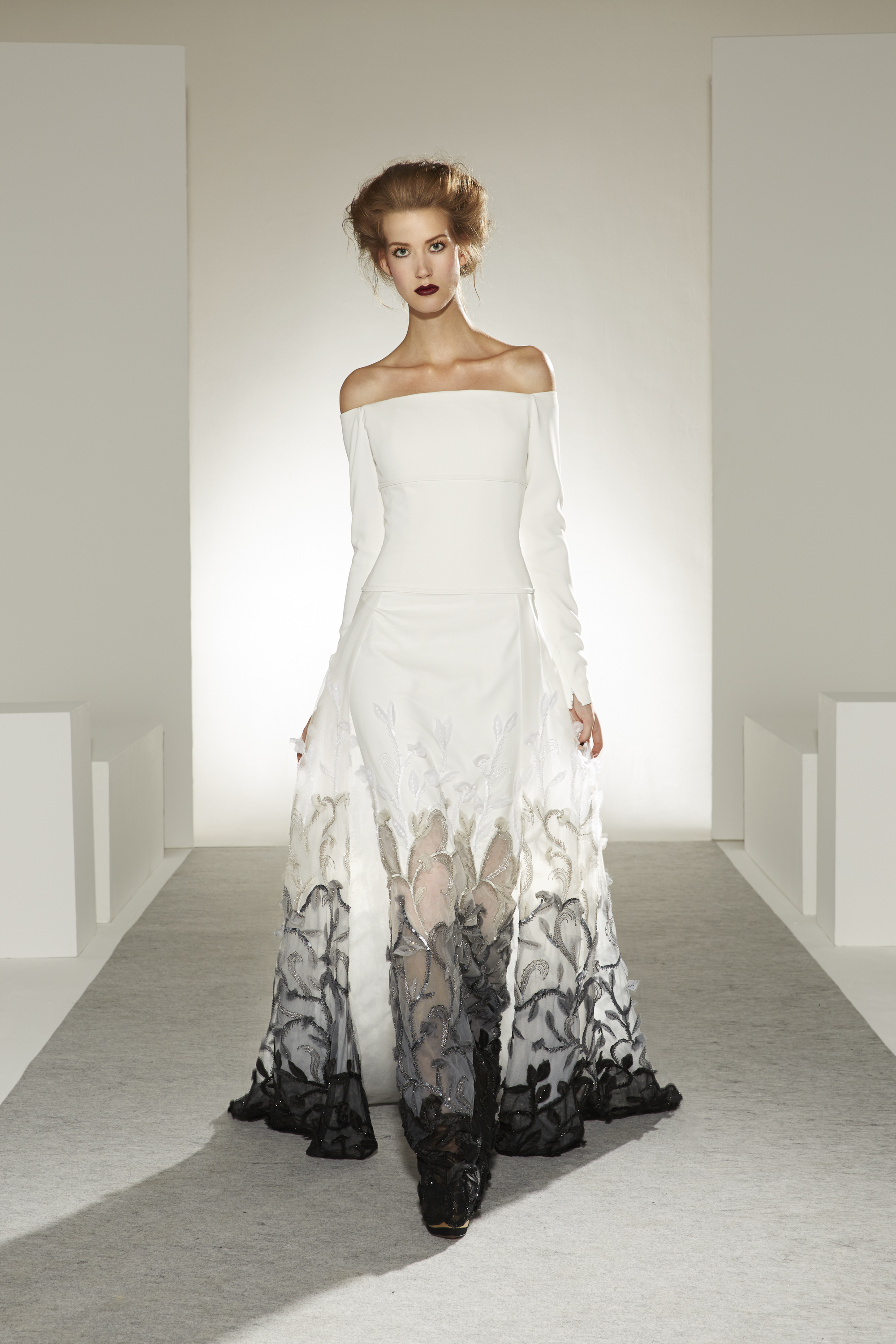 Bonheur : Noce artistique de blanc onirique et de noir brut d’inspiration, la robe de mariée complète le tableau -contemporain- d’une collection partout heureuse d’unir désirs, plaisirs, et réalité.