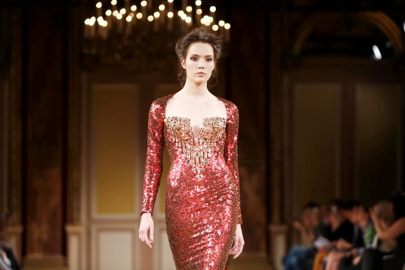 Velours, crêpes, lamés de soie ou paillettes chaines révèlent les fourreaux des grands soirs, inventant en jeux de transparence, des volutes et des asymétries. Le jacquard de soie bouillonne et façonne la tournure d’une jupe ou celle d’une traine. Des feuilles de rhodoïd comme découpées au scalpel, s’irisent sous la lumière.