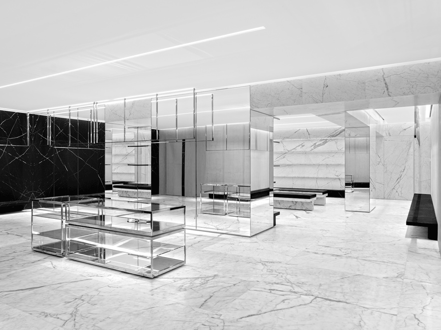 Plus personnellement, Saint Laurent Paris m’intriguait beaucoup depuis l’arrivée de Slimane, qui m’avait ébloui auparavant chez Dior Homme. Je me suis rendu il y a peu dans le flagship Saint Laurent sur l’avenue Montaigne, et c’est sans doute la meilleure expérience boutique de luxe que j’ai eue. À la base pour voir les pièces et les matières de plus près, je me suis retrouvé en moins de vingt minutes dans une immense cabine d’essayages toute en marbre et miroirs, ambiance futuriste (un peu claustro), avec une sublime veste en daim sur les épaules. Autant vous dire que la veste n’a pas quitté la boutique, mais la Saint Laurent girl qui m’a accompagné durant le périple connaissait son sujet sur le bout des doigts, et c’était un régal que de l’écouter me parler de la marque.