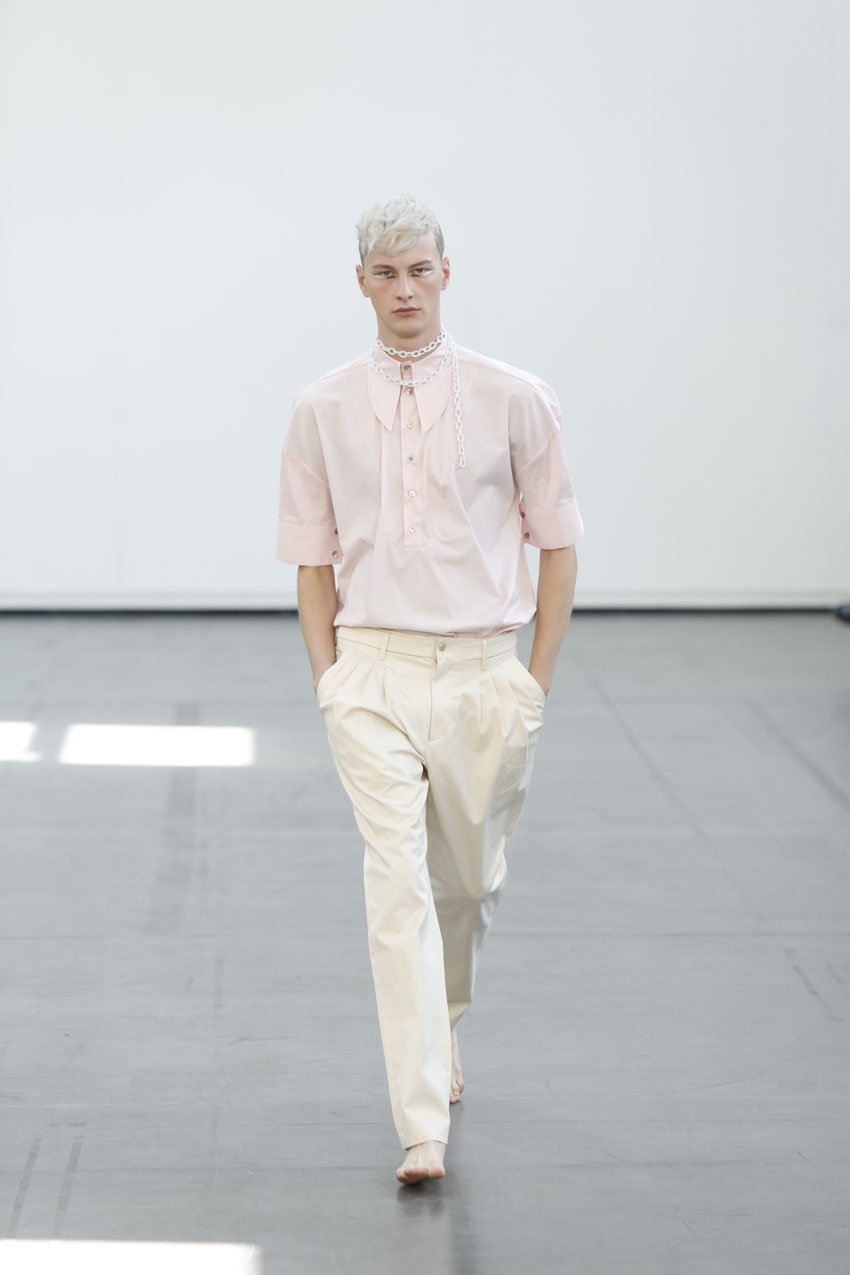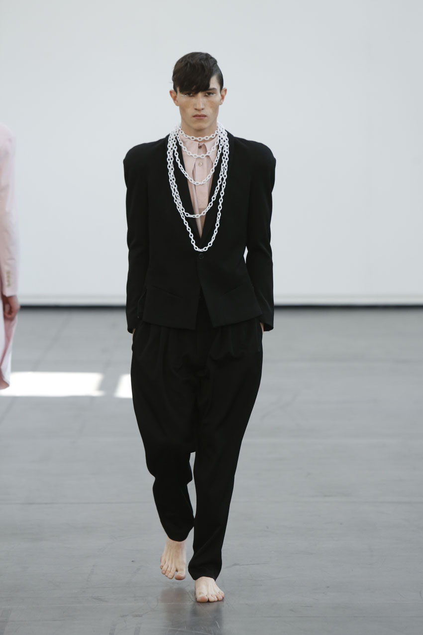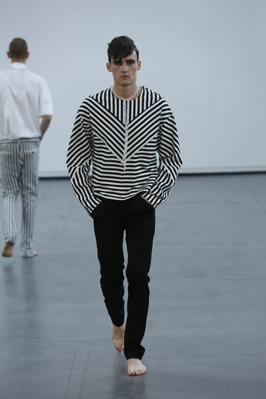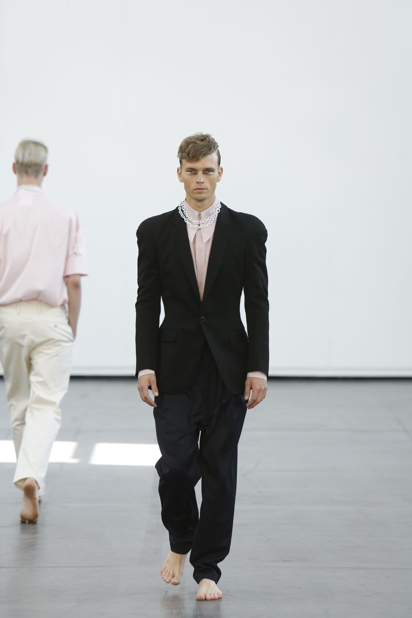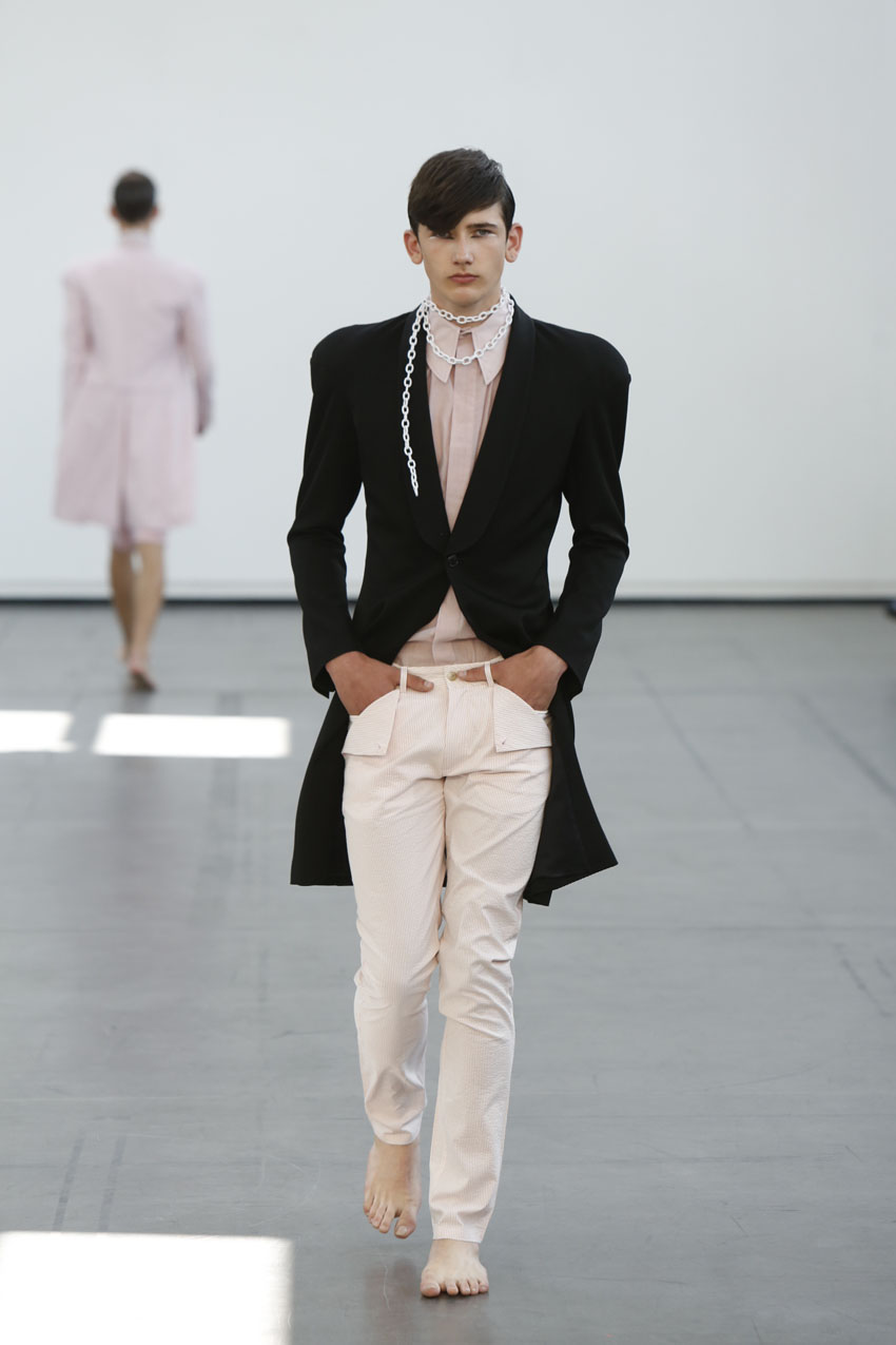 Le créateur hongkongais est venu présenter à Paris sa collection Homme, Printemps/Été 14. Puissamment inspiré par le film d’Alan Parker, Birdy, il se plait à envisager un univers d’hommes-oiseaux. Pas tout à fait en cage, pas tout à fait libres, ils tendent à s’affranchir de leur condition. Quelques détails de la silhouette démontrent cet inusuel état. Epaulés rondes, découpes, évoquent l’animal avant l’envol.