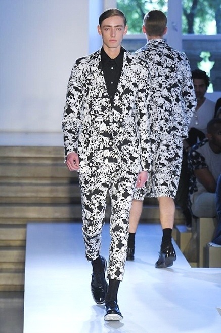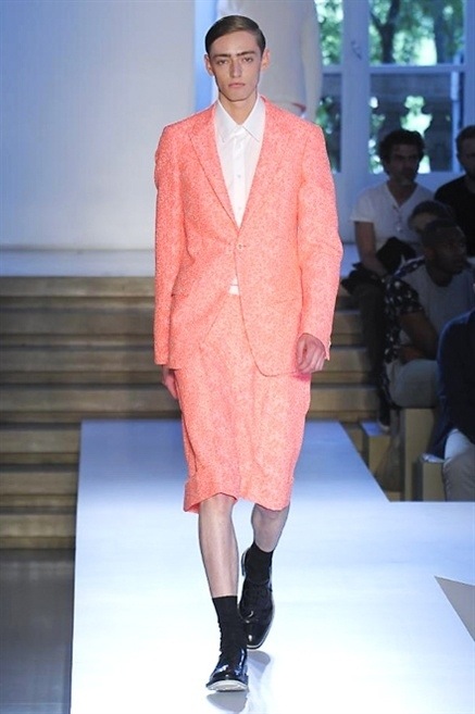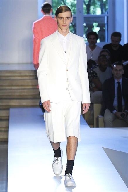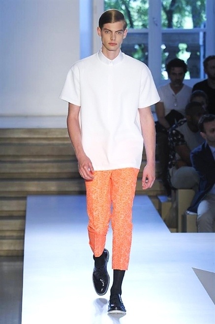 Les coupes sont carrées, empreintes de l’esthétisme chez Jil Sander. A la rigueur des coupes le seuls strictes est injectée une dose de clins d’œil au sportswear : les chemises bicolores et les lignes le long des coutures des pantalons rappellent aisément les tenues sportives. Pour les tenues plus habillées, Jil Sander retrousse les pantalons de ces messieurs mais elle leur propose aussi des shorts, bermudas et même des skorts (jupe+short).