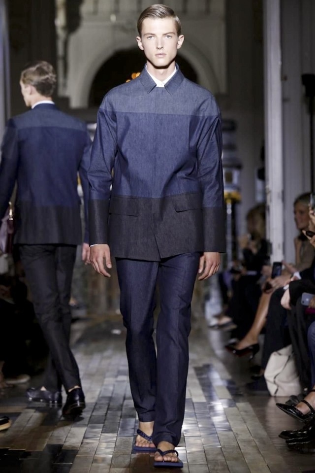 Le bleu est la couleur de la saison chez Valentino, et l’on voit que la maison sait aussi être moderne grâce à l’utilisation de denim sur denim. La coupe classique des costumes est dédramatisée par le port de tongs et sandales qui donnent à la silhouette son côté estival.