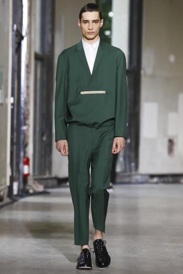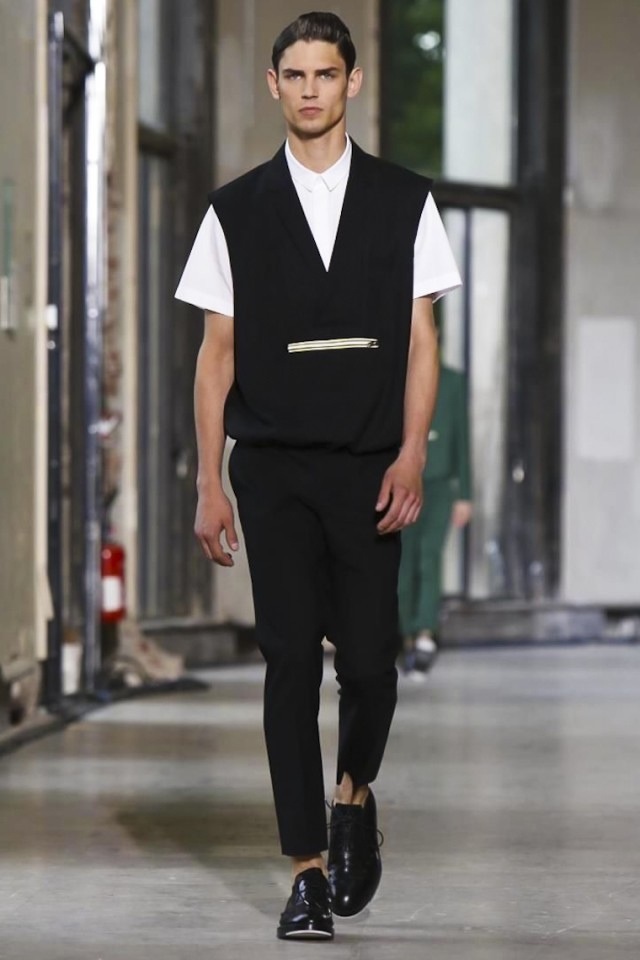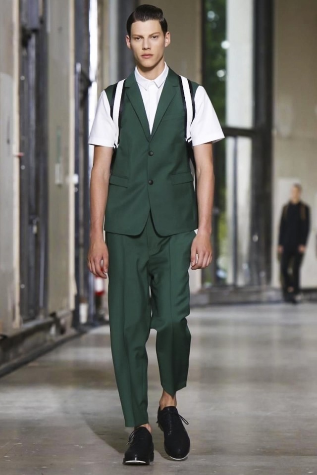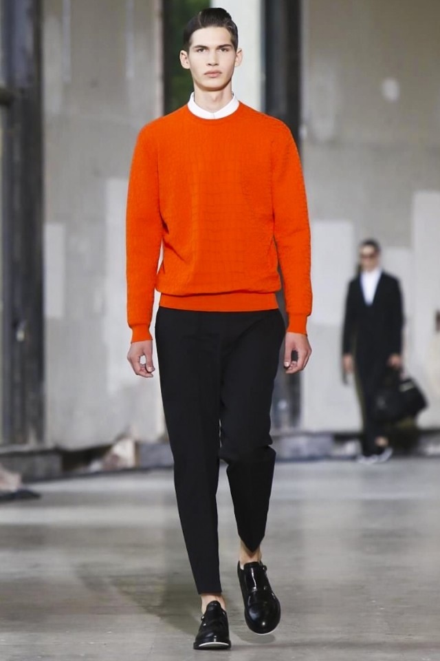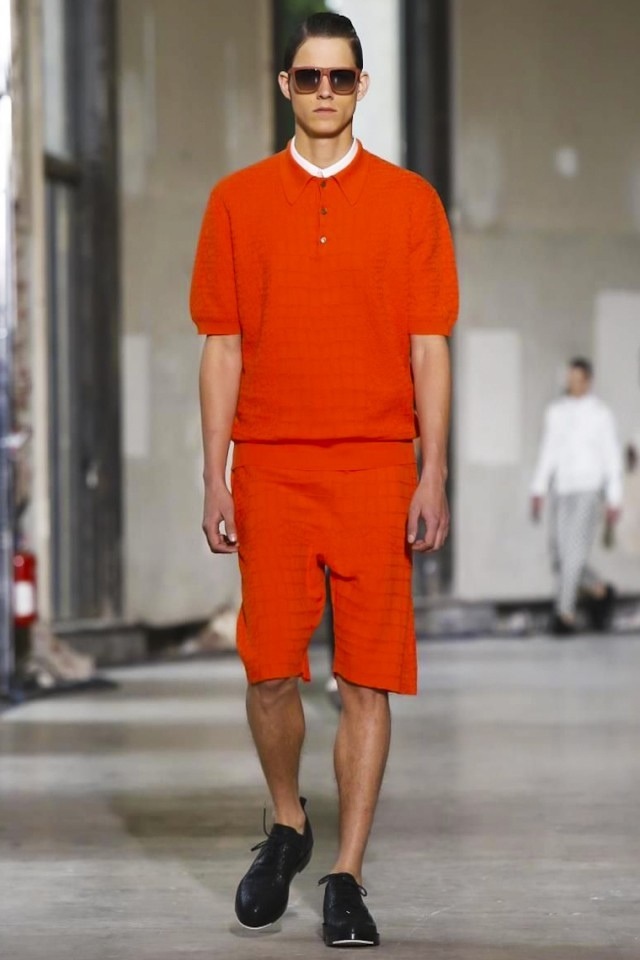 La palette de couleurs est rafraîchissante chez KRISVANASSCHE : bleu marine, vert prairie, orange, rouge tirant sur le fuchsia des couleurs fortes qui créent des looks marquants. Chez Kris Van Assche, on n’a donc pas peur de la couleur et le total look est la pour appuyer cette affirmation. En ce qui concerne les imprimés et motifs, Kris Van Assche se limitent aux pois et à la texture crocodile (impression 3D) sur les tshirts.