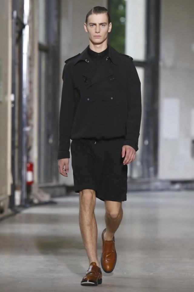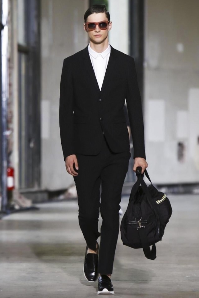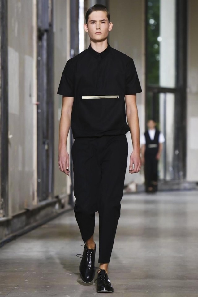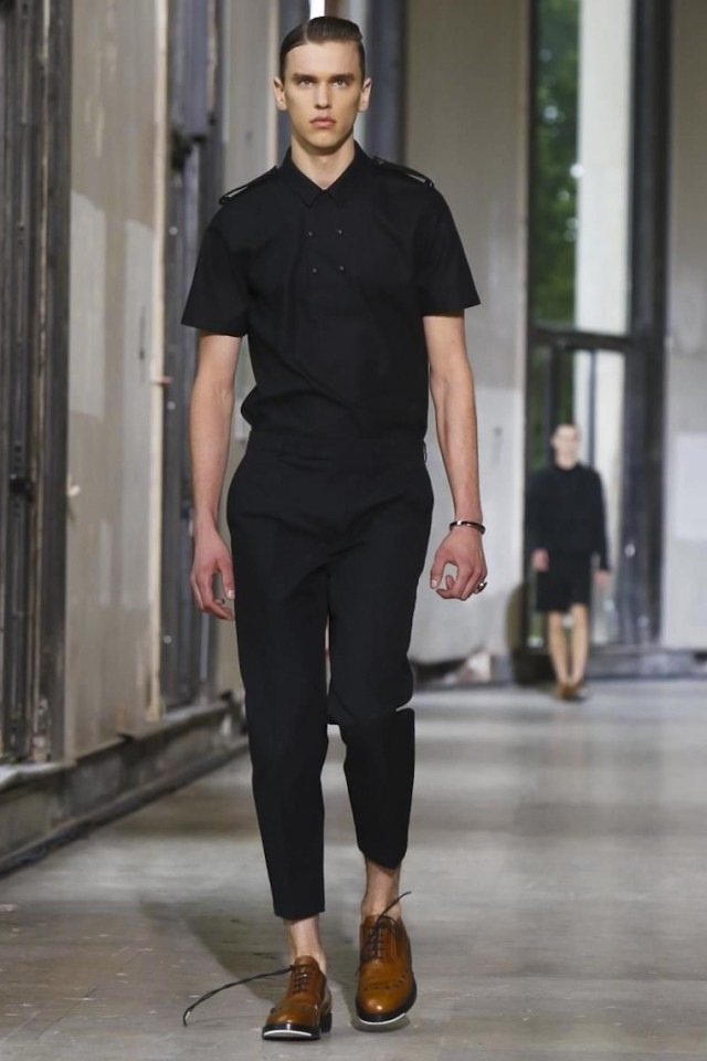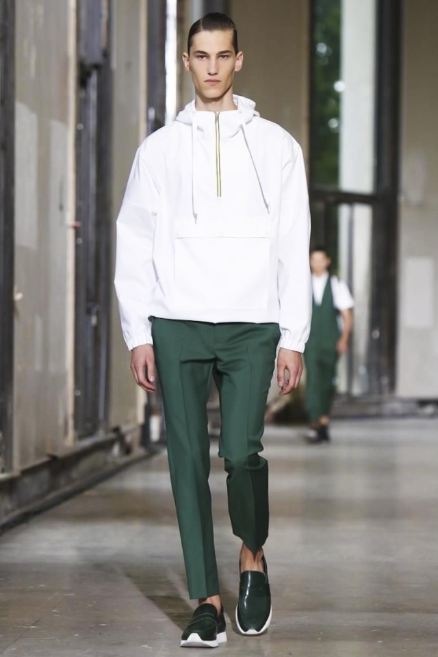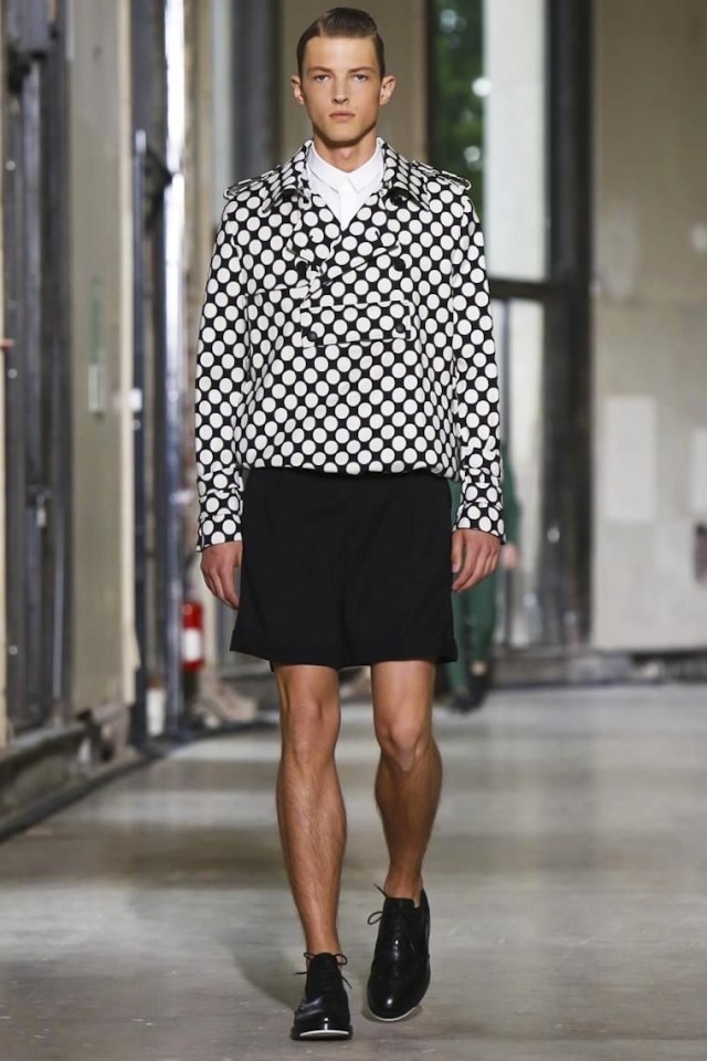 La palette de couleurs est rafraîchissante chez KRISVANASSCHE : bleu marine, vert prairie, orange, rouge tirant sur le fuchsia des couleurs fortes qui créent des looks marquants. Chez Kris Van Assche, on n’a donc pas peur de la couleur et le total look est la pour appuyer cette affirmation. En ce qui concerne les imprimés et motifs, Kris Van Assche se limitent aux pois et à la texture crocodile (impression 3D) sur les tshirts.