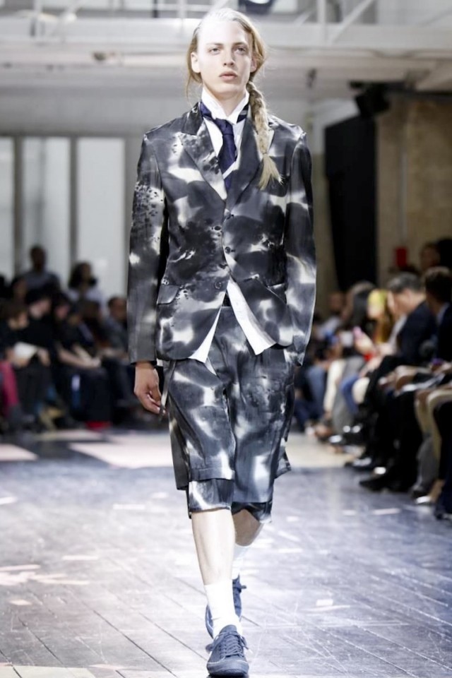 Le noir et blanc ainsi que les superpositions jouent un rôle important dans cette collection printemps/été 2014 et le designer réinterprète des classiques de la garde-robe masculine à sa manière : les pantalons sont doublés, les chemises et vestes sont découpées à des endroits inattendus.