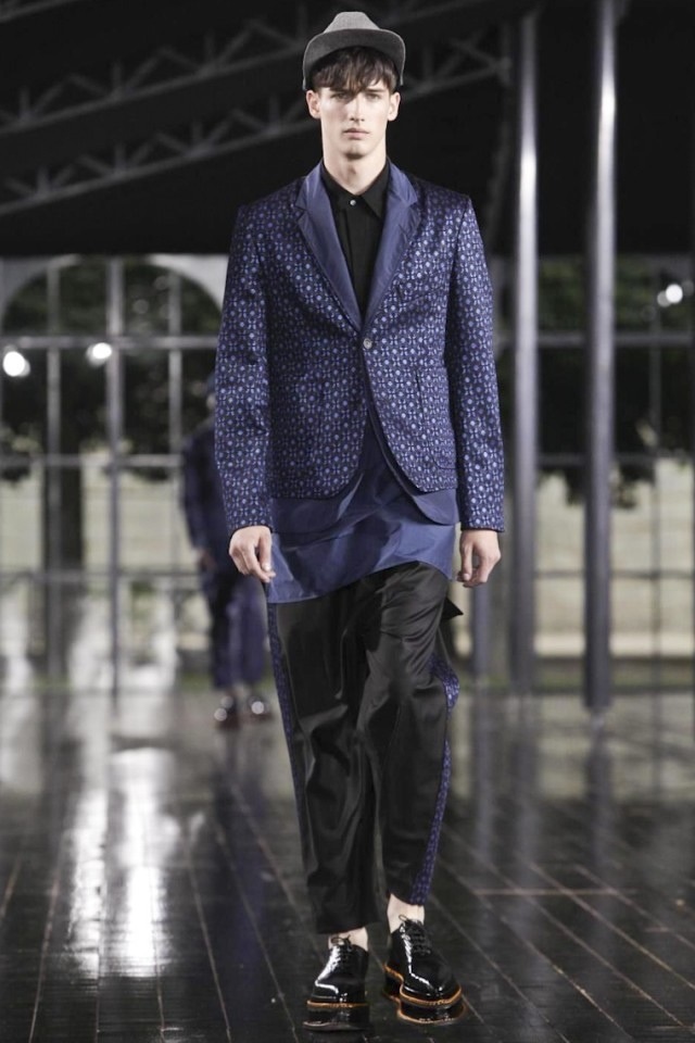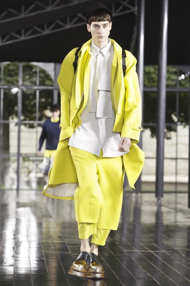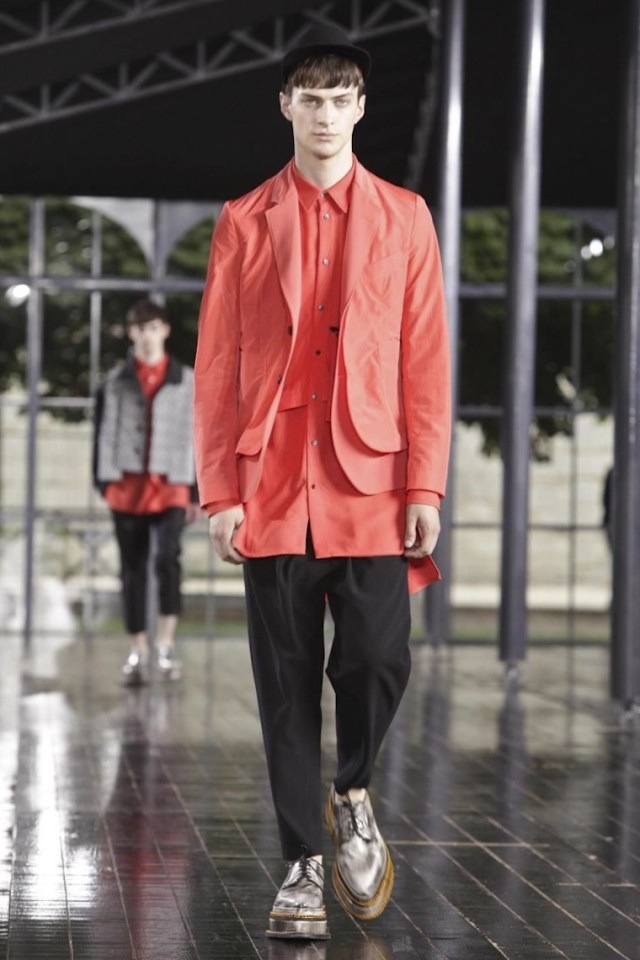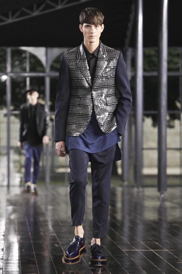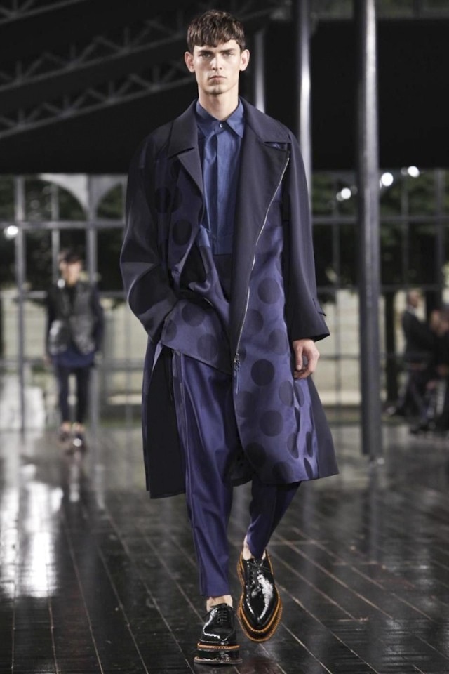L’attitude de l’homme John Galliano s’étend de classique à détendue. Le créateur expérimente avec les couches et les longueurs inégales ce qui en fait une collection s’adressant aux plus jeunes (le genre a porter des chaussures à plateforme).