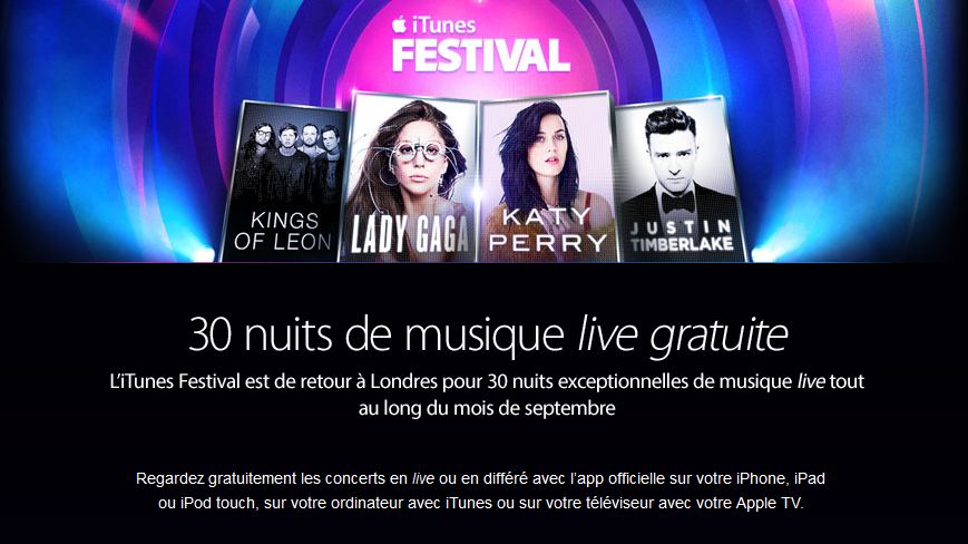 Quel est le concept ? Chaque soir, durant tout le mois de septembre, l’iTunes Festival offrira plus de 60 performances dans la salle mythique du Roundhouse de Londres. Ces performances peuvent être visionnées en live ou à la demande sur iPhone, iPad ou iPod touch, et également par les amateurs de musique depuis iTunes sur un ordinateur ou en HD grâce à l’Apple TV. Les billets sont gratuits et uniquement destinés aux gagnants des concours. Tous ces concerts peuvent être visionnés gratuitement. C’est Lady Gaga qui a ouvert le bal dimanche soir en dévoilant des chansons de son nouvel album Artpop.