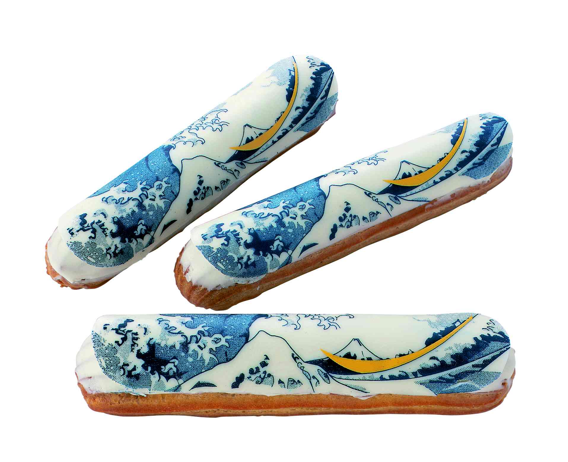 Ainsi, La Vague du célèbre peintre japonais Hokusaï illustre un éclair à la crème légère vanille et au beurre d’Echiré demi-sel, il est au Japon ce que l’éclair Joconde est à la France. L’éclair Koïnobori a quant à lui été créé pour la fête des Enfants, célébrée le 5 mai de chaque année et où les japonais font flotter au vent des poissons de tissus multicolores. Il se pare d’une crème légère vanille, fraise pour la version rose et de myrtille pour la version bleue, le tout réhaussé d’une coque en chocolat blanc.